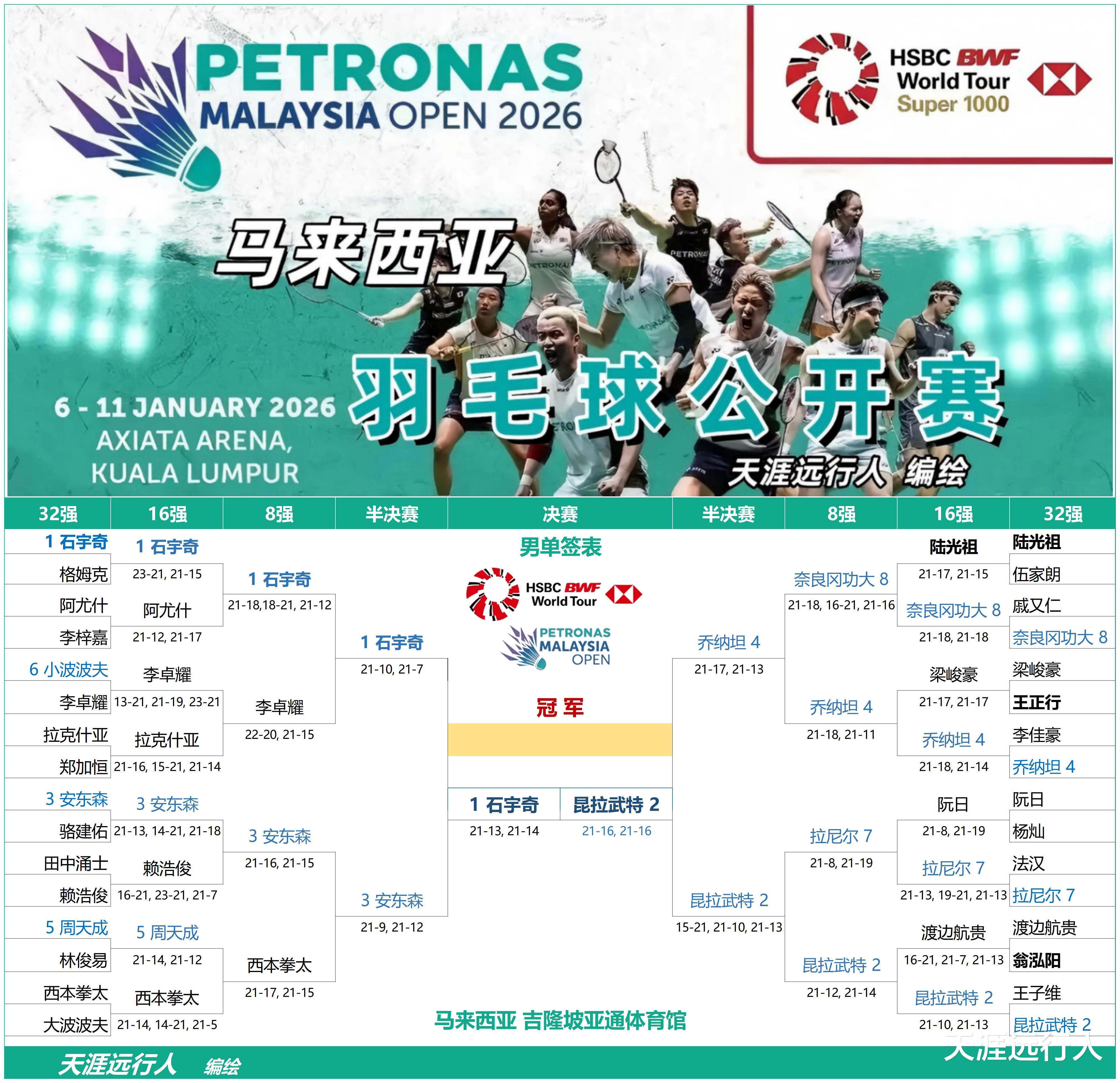 北京时间1月10日19时21分,2026世界羽联超级1000马来西亚公开赛半决赛的十场角逐,全部决出了胜负,决赛对阵出炉。