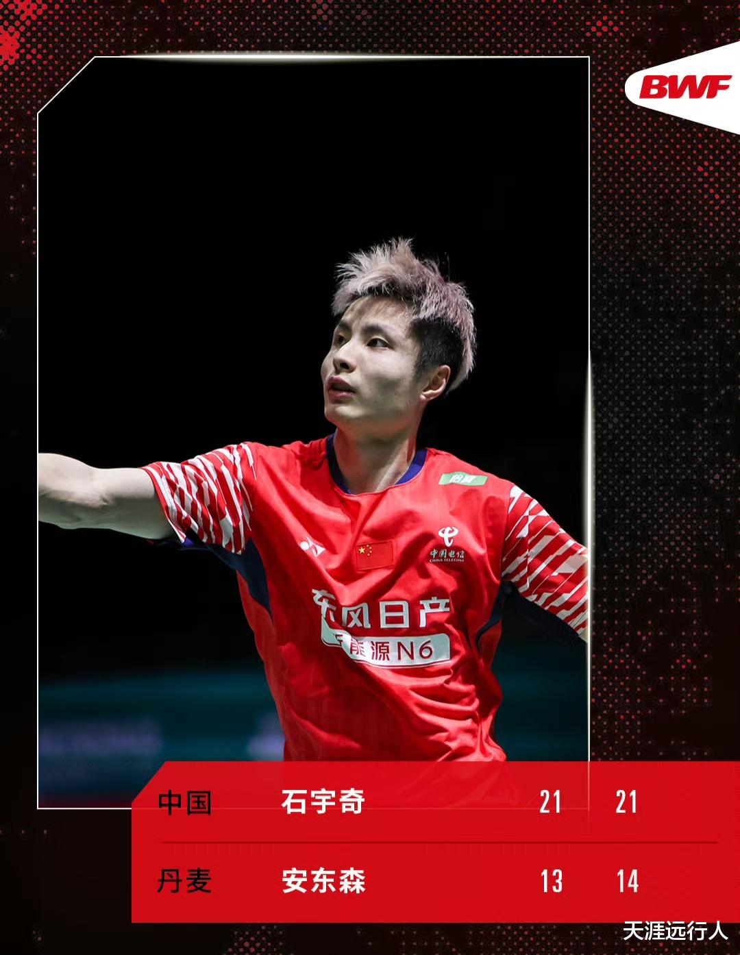 石宇奇以21-13, 21-14,战胜丹麦名将安东森,晋级男单决赛,取得双方交手的两连胜,把两人之间的交手记录改写成8-4领先,决赛将与昆拉武特争夺男单冠军。
