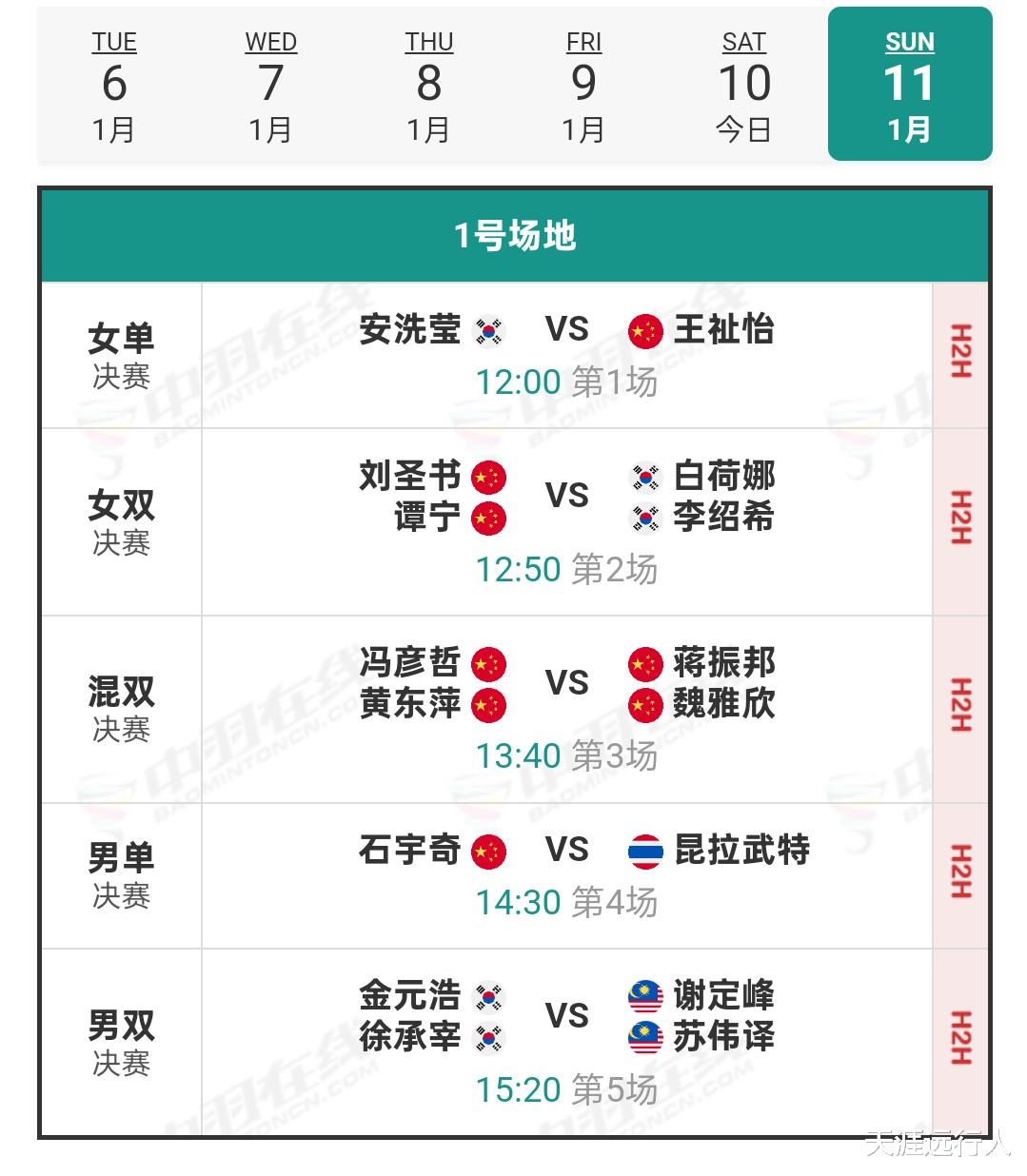 国羽军团共6人闯入四强,陈雨菲赛前伤退,五位球员出战当日该轮次的争夺,全为外战,大获全胜,混双冯彦哲/黄东萍跟蒋振邦/魏雅欣两对组合包揽冠亚军;男单石宇奇轻取丹麦安东森,与昆拉武特约战决赛;女单王祉怡力克印度富婆辛杜,决赛再战本轮轮空的世一姐安洗莹;女双刘圣书/谭宁横扫韩国组合郑那银/李妍雨,决赛静待另一对韩国球员白荷娜李绍希争金。