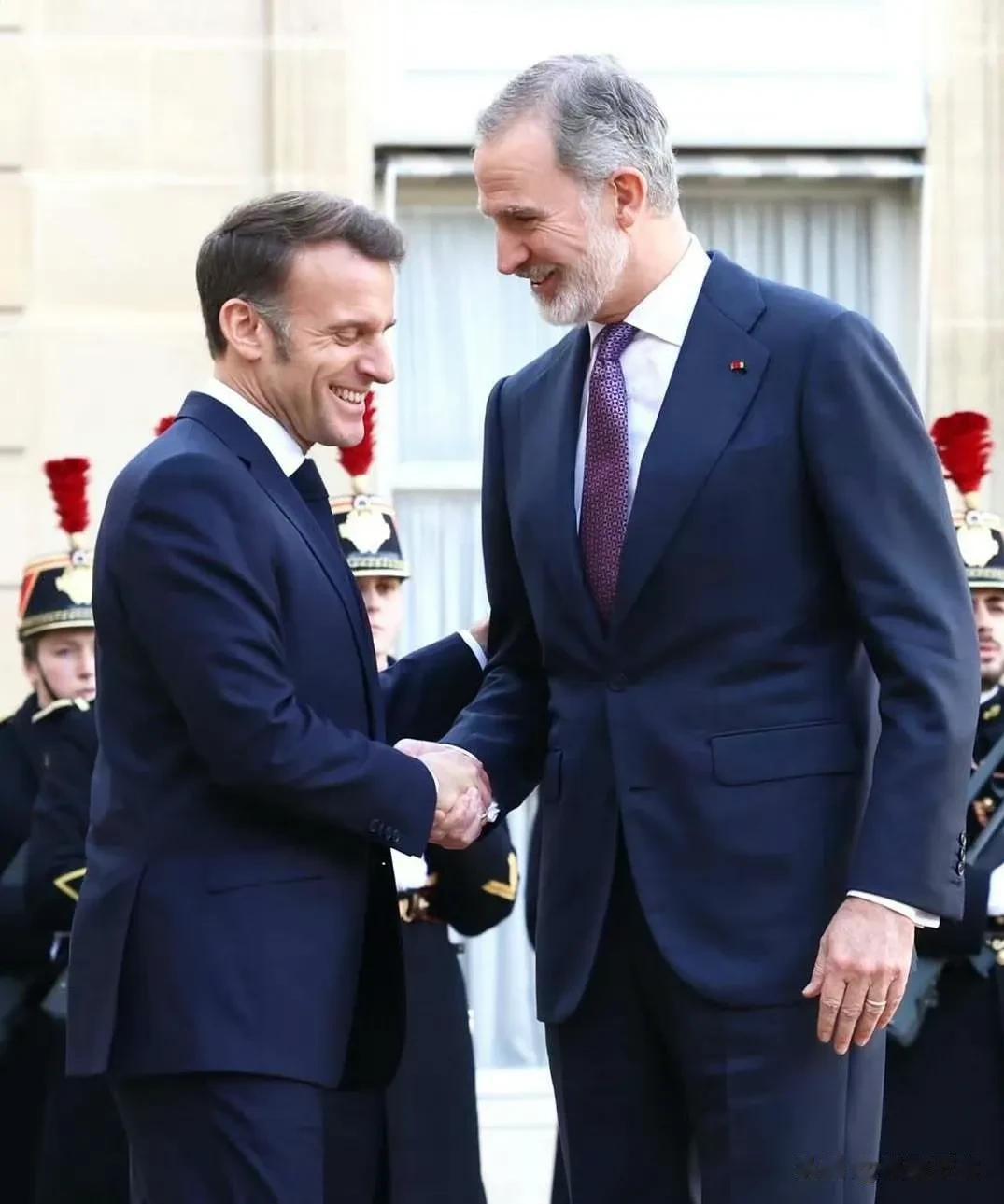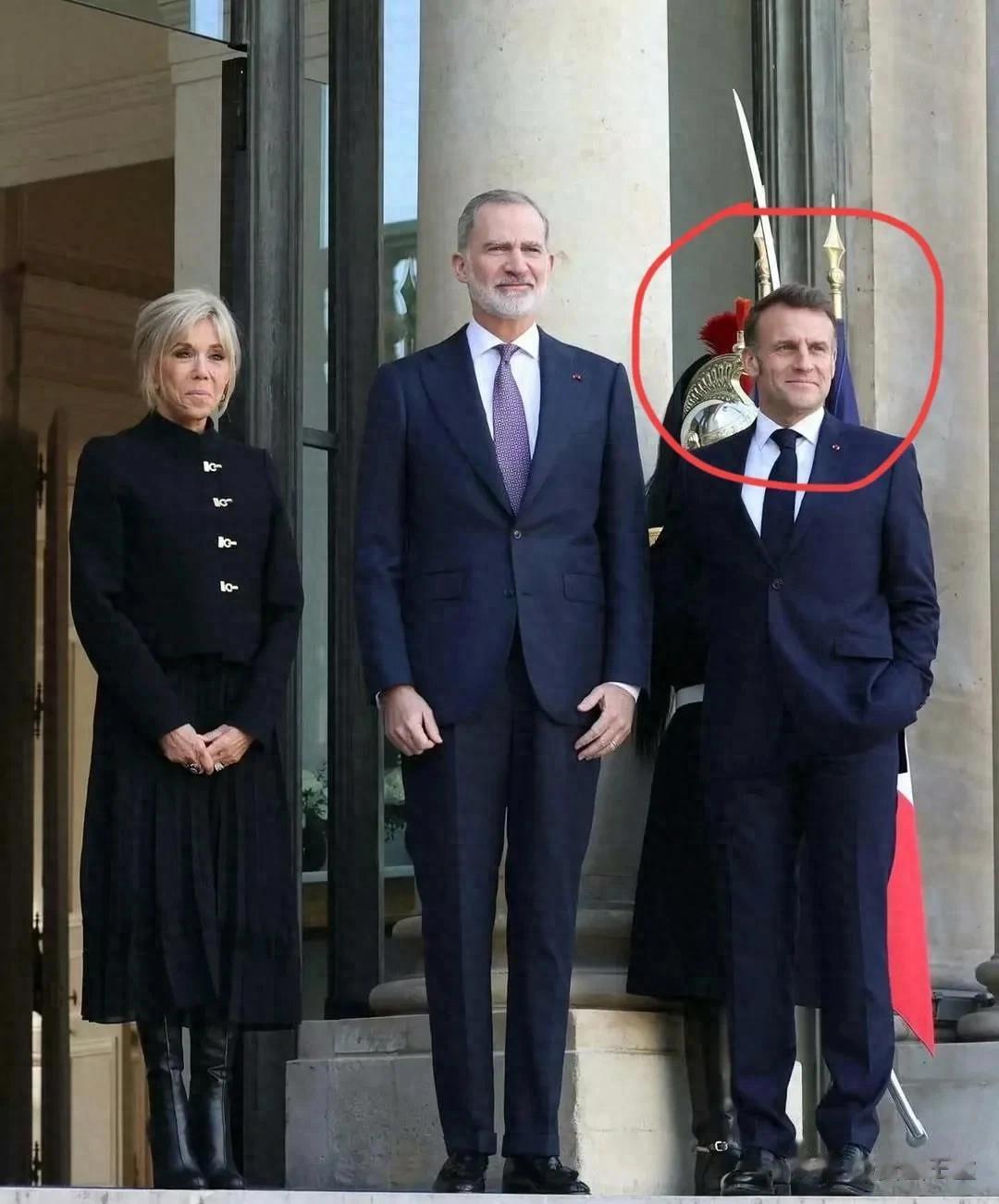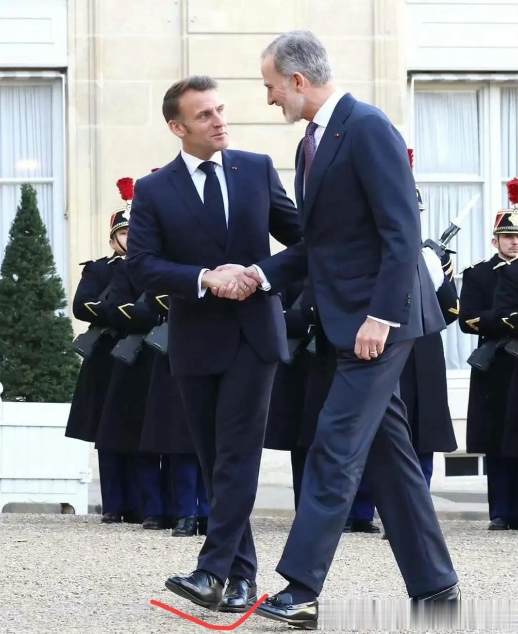 这次备受网友热议的是马克龙,面对197CM的费利佩国王,马克龙也不自信了,从两个细节就能看出来。