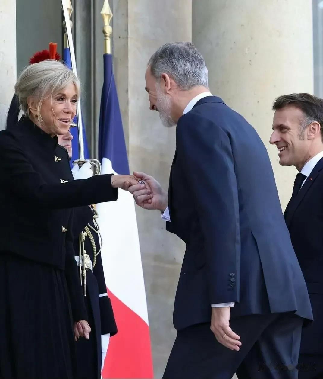 在马克龙上前迎接费利佩国王后,布里吉特也与国王互致问候,并行了一个传统的吻手礼。