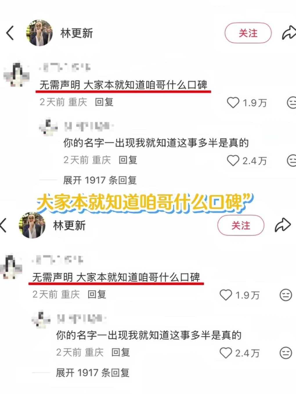 他的评论区里有人证明林更新口碑的,简直就是不是恶评胜似恶评啊[笑哭][笑哭][笑哭]