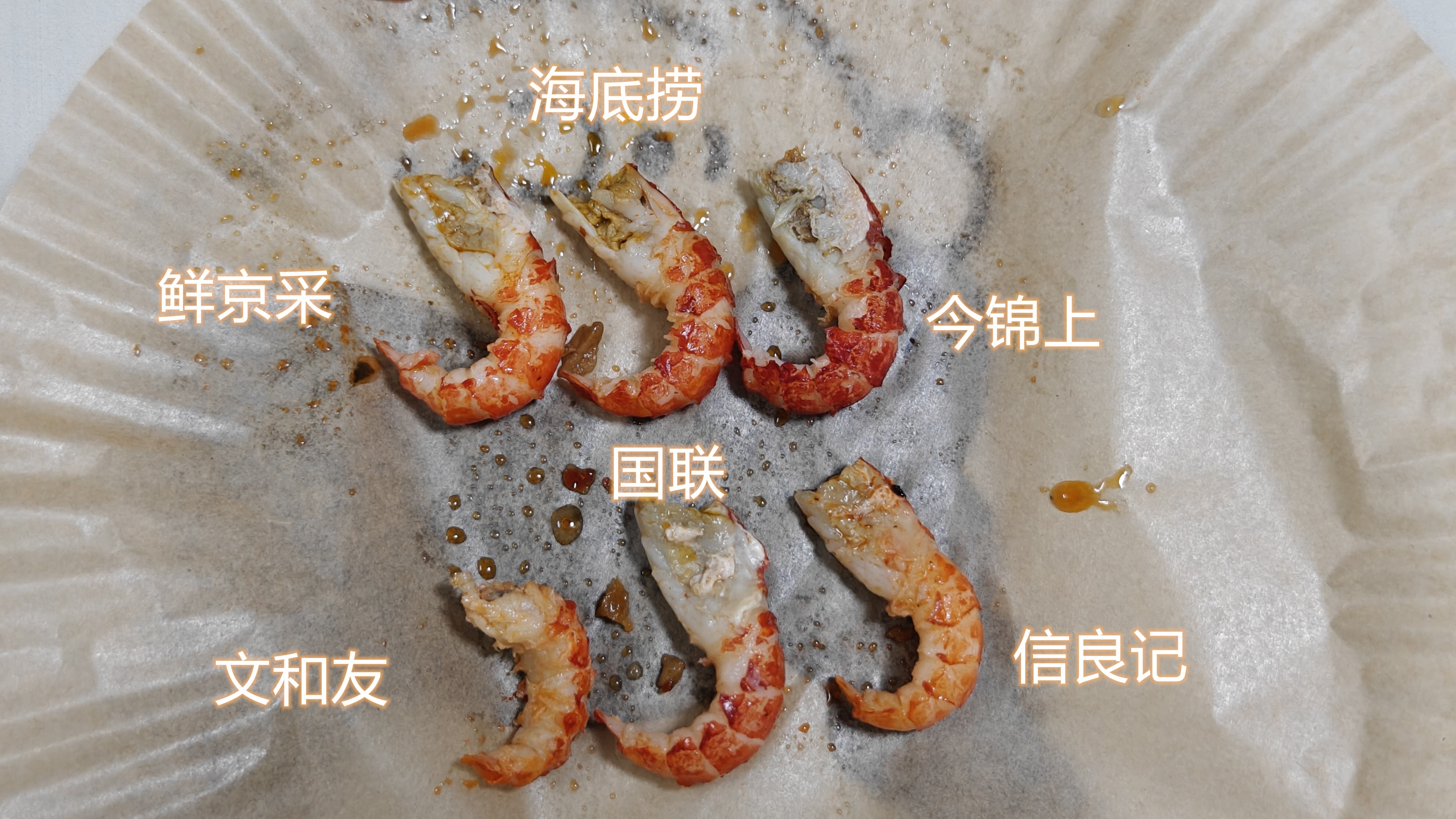 ▼再来比较一下小龙虾出肉的情况,国联的小龙虾肉质非常饱满,几乎同样的大小,小龙虾肉就是显得更丰满一些,鲜京采、海底捞、今锦上、信良记的虾肉大小差不多,而文和友虽然是虾尾,不过虾肉大小明显要比其它几款小不少。