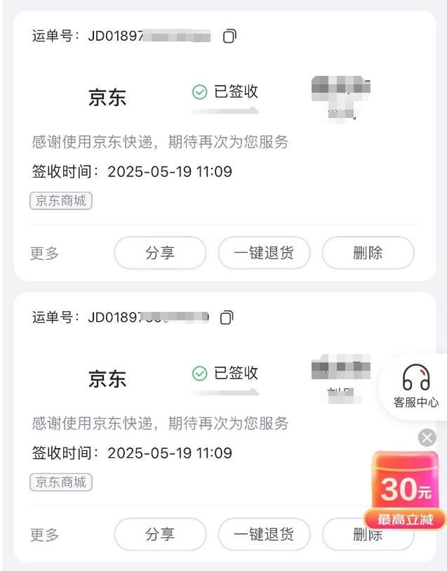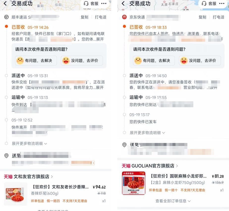 ▼天猫的两个旗舰店分别一个京东快递、一个顺丰速运,两个都是在19日下午送达,分别耗时42小时、45小时。