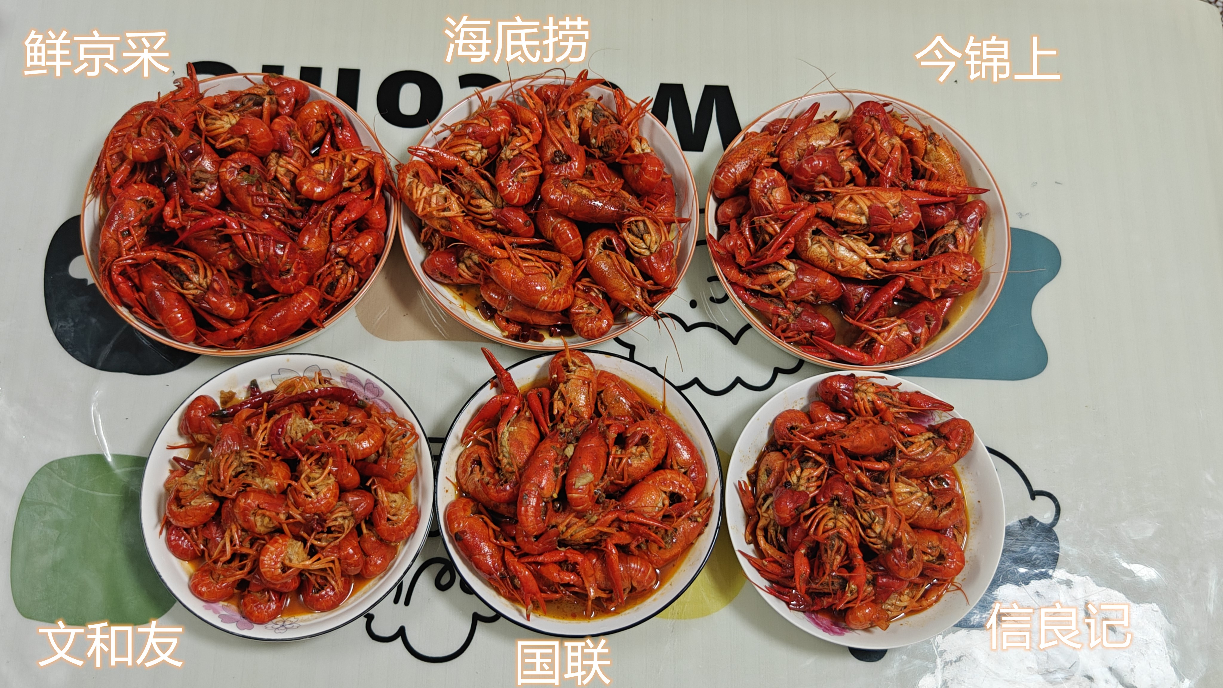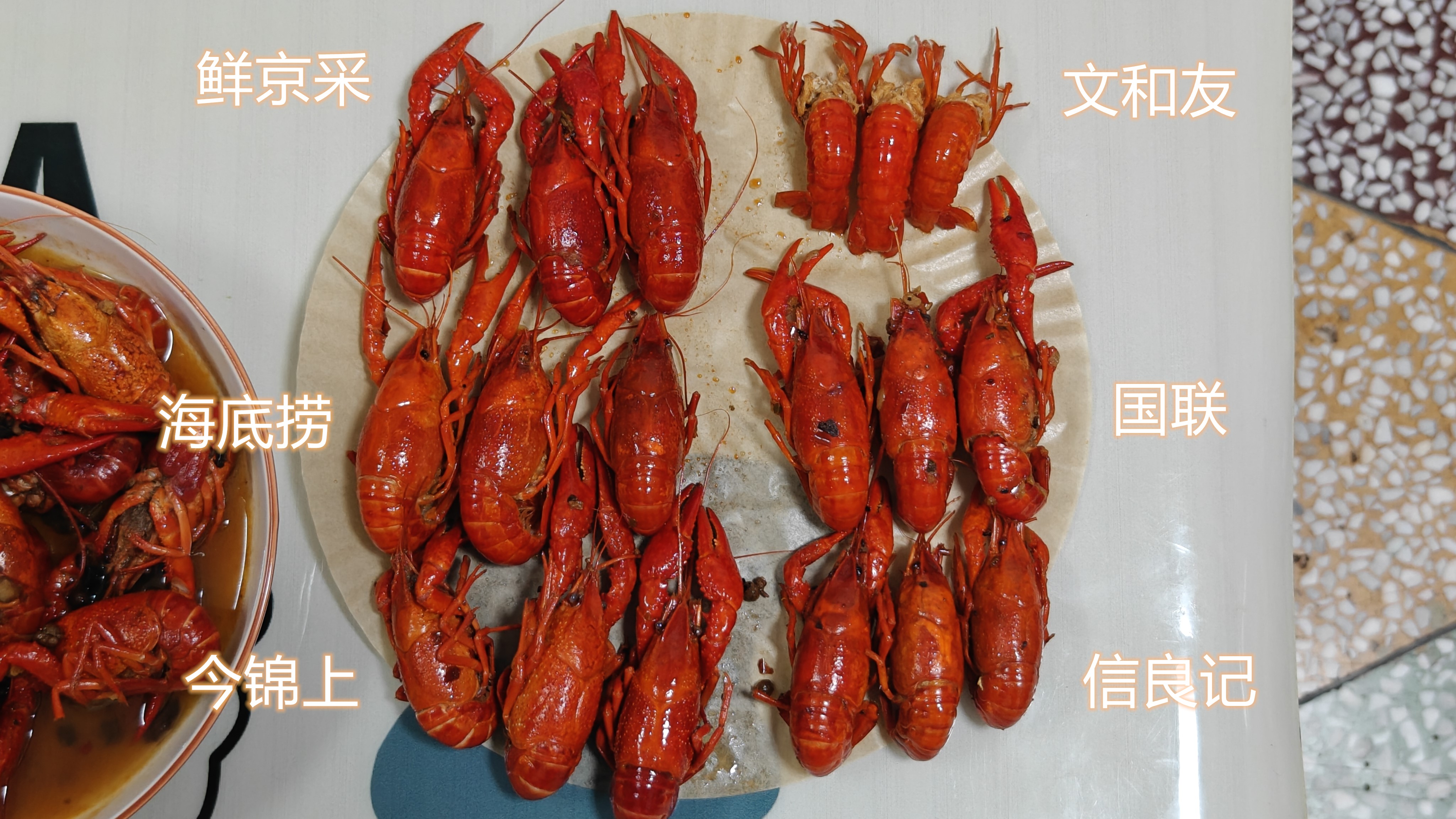 ▼每款小龙虾随机取了三只,对比一下小龙虾个头均匀度,今锦上、文和友、国联存在的小龙虾大小不一的情况,有少量比较小的小龙虾,其它几款个头都还蛮匀称的,一眼看过去,不会有特别突出的个头。