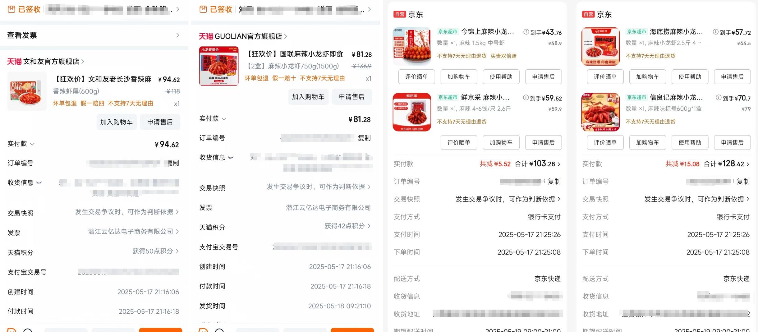 ▼我选择在同一时间下单这6款麻辣小龙虾,而且分别从京东、天猫下单,对比看看它们在配送时效上有没有差异。我下单的时间是在17日晚上9点半左右,天猫下单时间早十几分钟,这个时间差可以忽略不计。