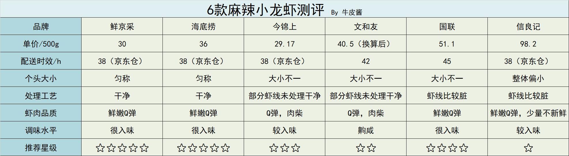 最后咱们通过表格来总结一下这6款小龙虾,大家在选购的时候可以参考一下。
