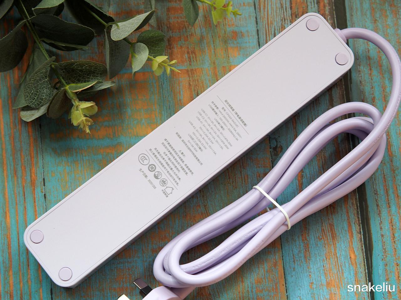 底部是产品的铭牌,不仅有USB充电的参数。看到这款插排还通过了各种安全认证,让我用这款插排非常安心。底部四角还设计了防滑脚垫,放置在桌面上很牢固稳定。在看侧面它使用的线材也是很粗壮的,最大支持2500w的功率输出,一般烧水壶或者微波炉都能轻松应对。