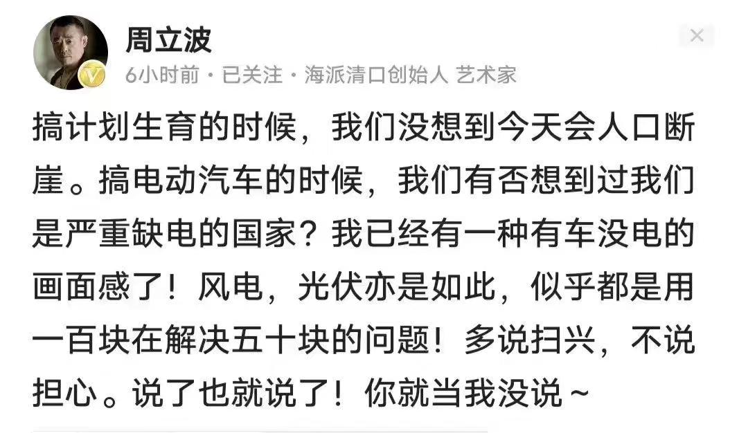 不知道有多少人还记得周立波。百度上说他是海派清口创始人、主持人、演员,其实就是个在上海地区有点儿影响的说相声的。他的出名,是因为一系列出格的无知言论和违法行为,最终因在美国吸毒、持枪、打手机开车等事件,回国后销声匿迹。现在,这个曾经红过一阵的过气艺人,大约是不甘寂寞,又跳出来发表无知言论,估计还是想求得人们砸砖关注,实现咸鱼翻身。周立波这次的言论,是嘲讽我国的计划生育政策和发展新能源汽车战略。计划生育政策是在当时科技水平低下、物质生产极度匮乏下提出的国家基本策略,有效控制人口对中国整体发展起到了重要作用。而且,人口控制论,最早由英国经济学家马尔萨斯于1798年提出。法国哲学家福柯也在论著中提到,人口控制伴随着人类发展的整个历史。这些有点儿学术性的东西,周立波不懂,可以理解,毕竟,他只是靠打嘴炮博名声的。但攻击新能源汽车战略,就有些丧心病狂了。要知道,新能源汽车是全球各国竞争的新赛道,不仅利于节能降排,对各国之间的科技和经济发展竞争也至关重要。他却说什么“已经有一种有车没电的画面感”,来讽刺和否定这项技术。活在当代,不知道当代的现实,真不知道周立波的脑子用来装什么的。目前的实际情况,不是没有电或者电不够,而是时段性的不够和时段性的多余,就是用电高峰期时电可能不够用,但用电低峰期时电力有剩余的,这是因为储电技术不成熟造成的。新能源汽车正好可以在电力剩余时充电、储电,避免电力浪费。对不懂的事情可以闭嘴,尤其是对国家大政方针,搞不懂的先向人请教、探讨,实在不懂了,可以在网上问问是怎么回事,敞开海派大嘴就来冷嘲热讽,还以为是在说相声,可以挣钱啊。