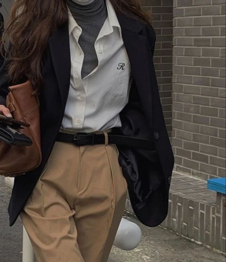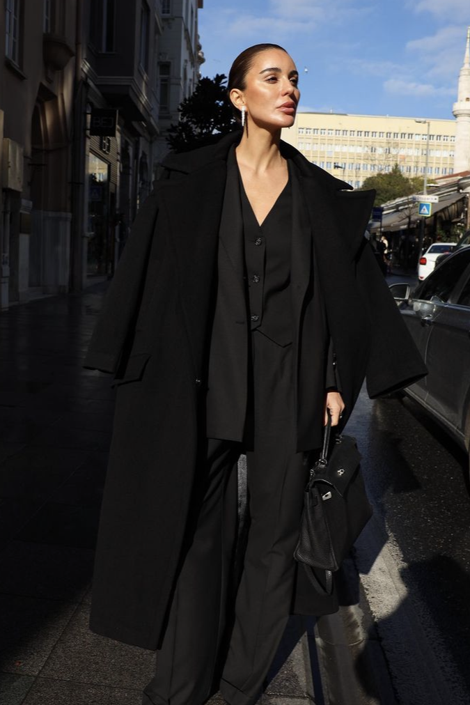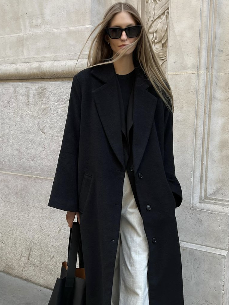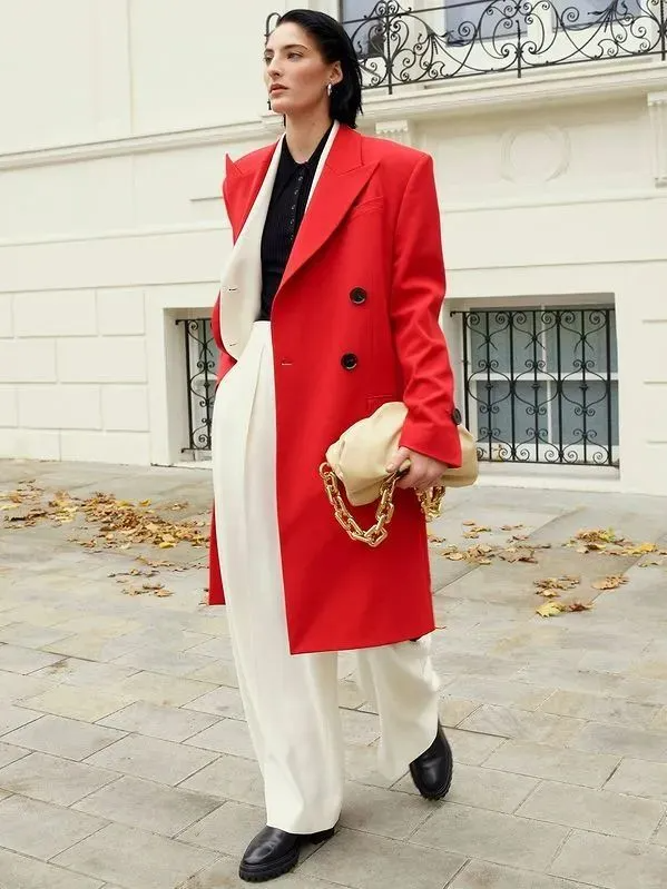 黑色大衣 + 西装的叠穿显正式,配一条白色阔腿裤,中和了厚重感,松弛感和利落感完美平衡。黑白撞色干净又高级。