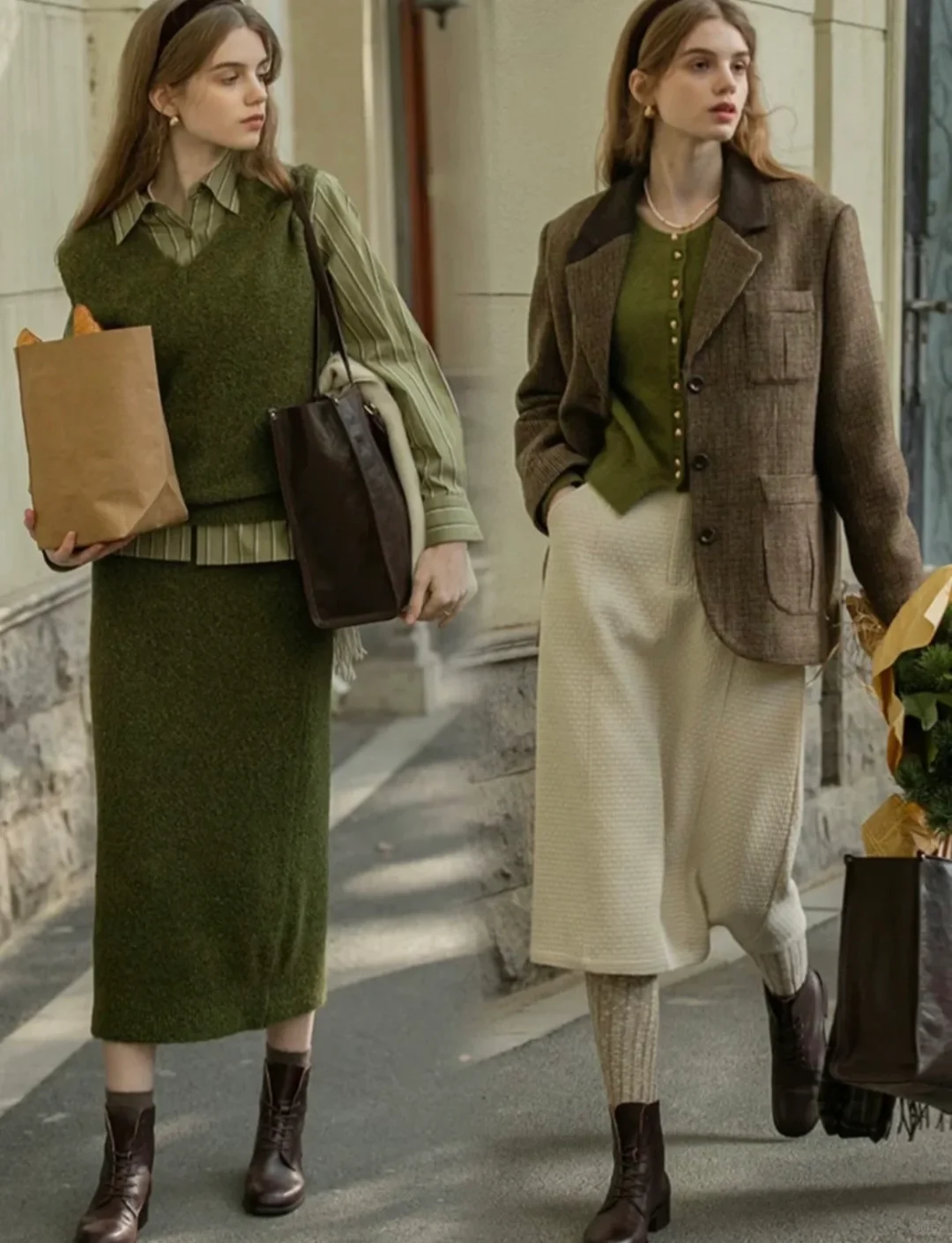 同色系搭配高级感十足,比如米色针织+米色裙子+棕色靴子。