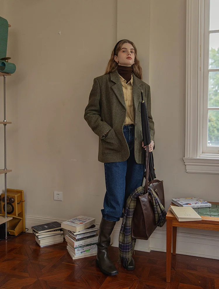 中间层搭配一件衬衫,注意不要系上所有扣子,露出里面的高领为佳。