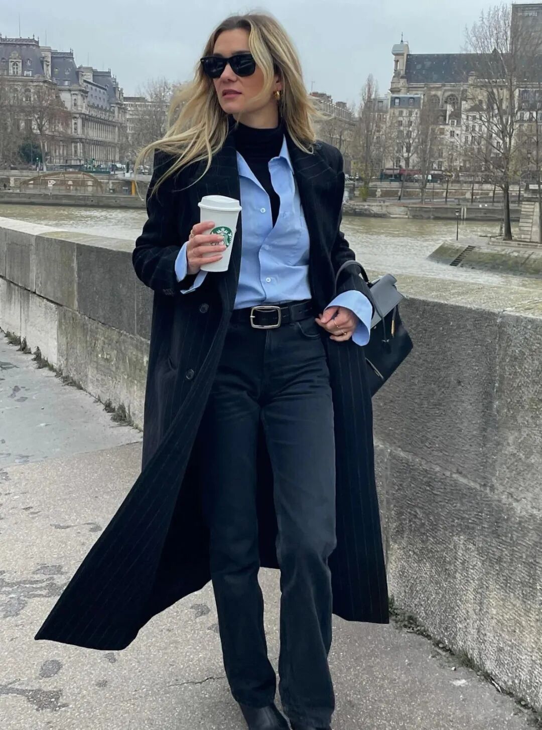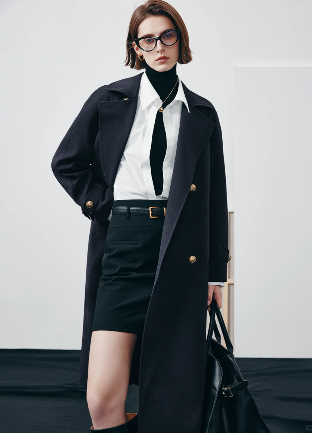 黑色高领打底衫+浅蓝色衬衫+黑色大衣,搭配直筒裤和短靴,干练利落又不失温暖感。