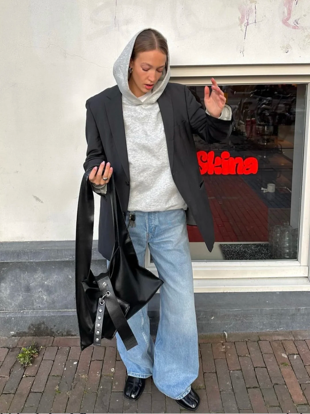 驼色搭配浅灰色连帽卫衣,驼色的暖调中和了浅灰卫衣的清爽,黑色阔腿裤压稳整体色调,尖头鞋又悄悄提升精致感,休闲与利落拿捏得刚好。