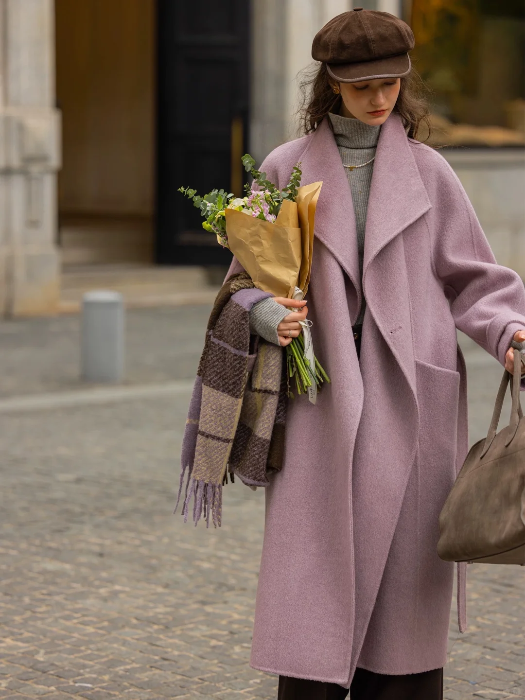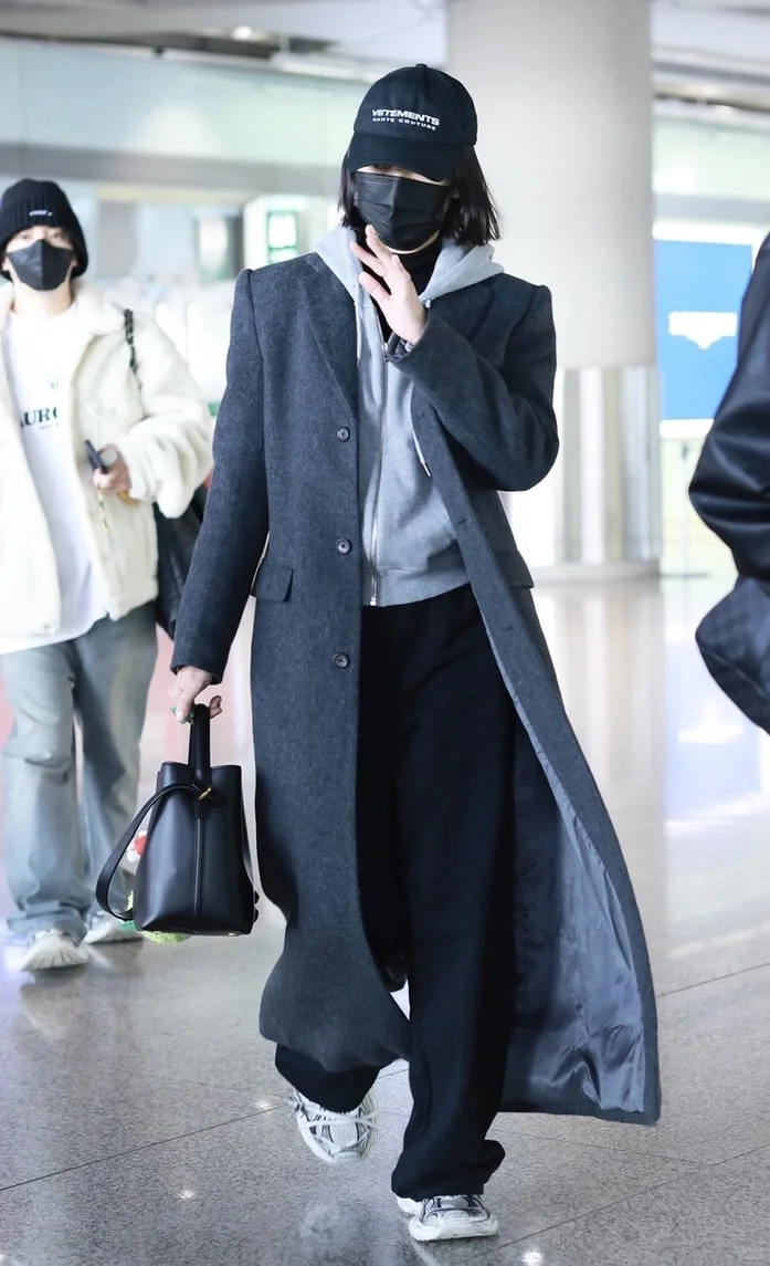 深灰色大衣搭配浅灰色卫衣,深浅灰的过渡温柔又不单调,黑色阔腿裤和鸭舌帽压场,休闲感和利落感刚好平衡。