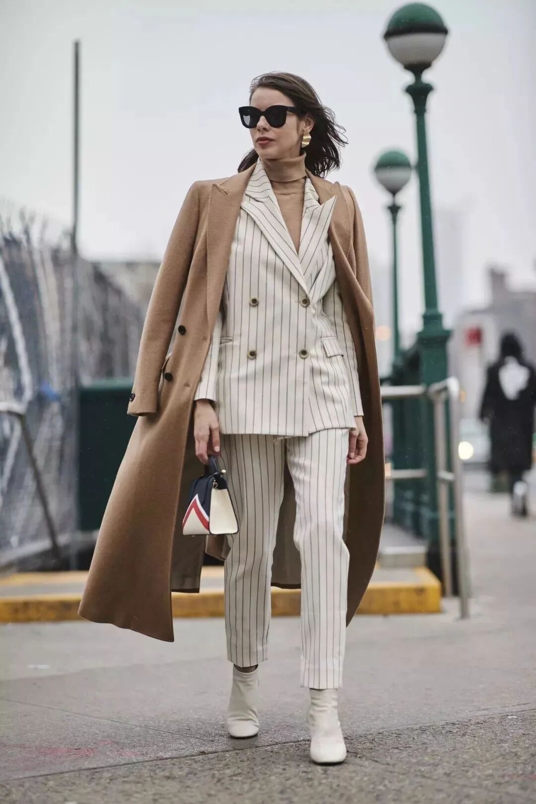 驼色大衣配白色条纹西装套装,西装内搭驼色高领衫,脚踩一双白色短靴,手拎通勤包,气场十足又不失时尚感。