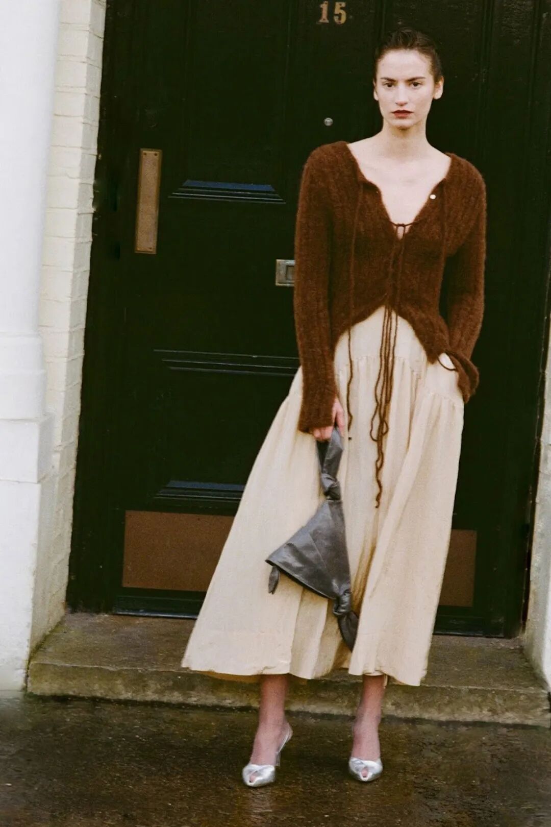 这组搭配特别适合在室内脱掉外套后,依然能保持精致感的造型。柔软的针织与飘逸的连衣裙组合,轻松穿出女人味。