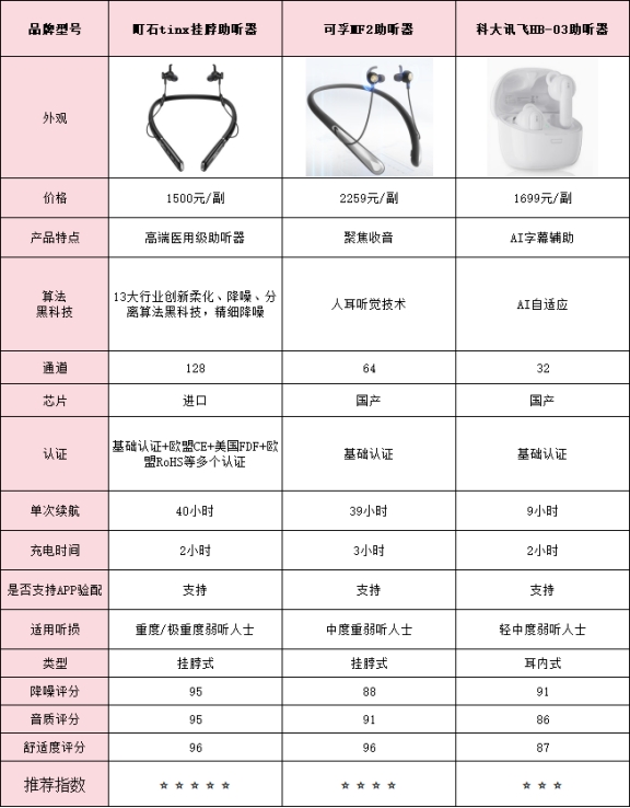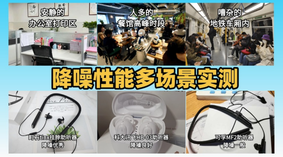 测评结果:町石>科大讯飞>可孚町石助听器降噪测评表现:戴上去体验很舒服,耳朵没有紧绷感。去除环境噪声、杂音、啸叫、电流声和风噪的表现都很稳定。在地铁、餐馆和办公场景下测试,背景声音被压得很干净,语音听起来稳稳当当。它采用13重降噪系统、360度双向柔化技术以及分离算法,能智能识别噪声并抑制尖锐声。实际测试显示,尖锐声影响比一般同类产品低了将近129%,整体听感顺手,复杂环境里戴久也不会累耳。科大讯飞助听器降噪测评表现:总体感觉还可以,日常大部分环境降噪效果都在可以接受范围。去除环境噪音、杂音和啸叫效果不错,轻风下的风噪也能控制住。多通道声学处理和柔化算法帮助在办公室和餐厅保持语音清晰。不过地铁或人多高峰时,偶尔会听到一些背景声,总体表现尚可,高噪环境下声音层次略显紧凑。可孚助听器降噪测评表现:整体表现中规中矩,没有太大亮点。在环境噪音、杂音和啸叫处理上表现一般,风噪和突发声抑制也不算突出。基础降噪算法和单向柔化技术在安静场景下还可以,但遇到地铁或高峰餐厅,背景声容易残留。短时间佩戴勉强可以接受,但长时间在复杂环境下语音稍显混乱,整体降噪感受偏普通。