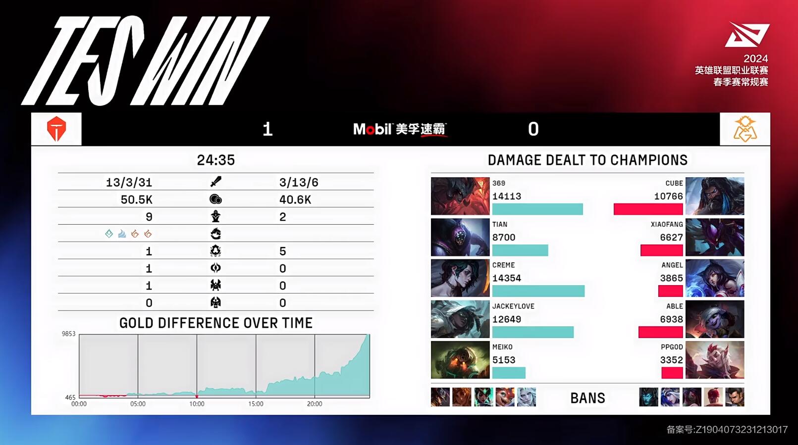 最终TES仅仅耗时24分35秒便碾压拿下第一局。