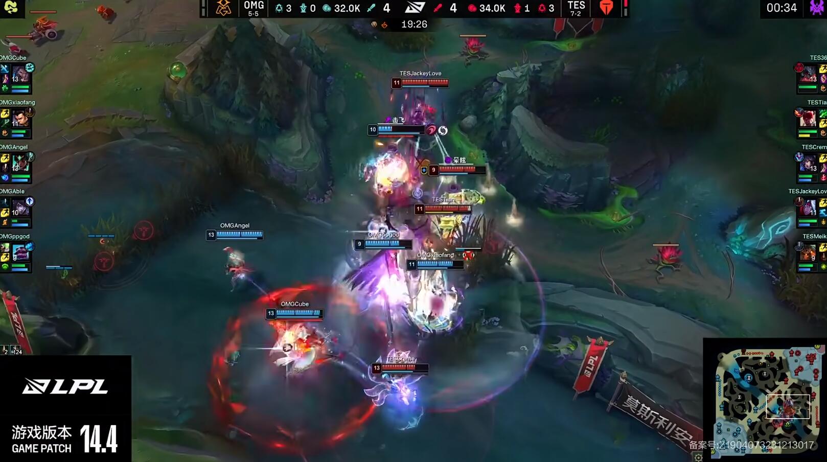 19分钟小龙团,OMG五人抱团强行挤视野,但Meiko在人群中精准的找到厄斐琉斯,配合JKL侧翼的输出瞬间融化掉OMG核心,TES打出一波0换4断掉OMG小龙节奏,经济差也拉开到了5K以上。