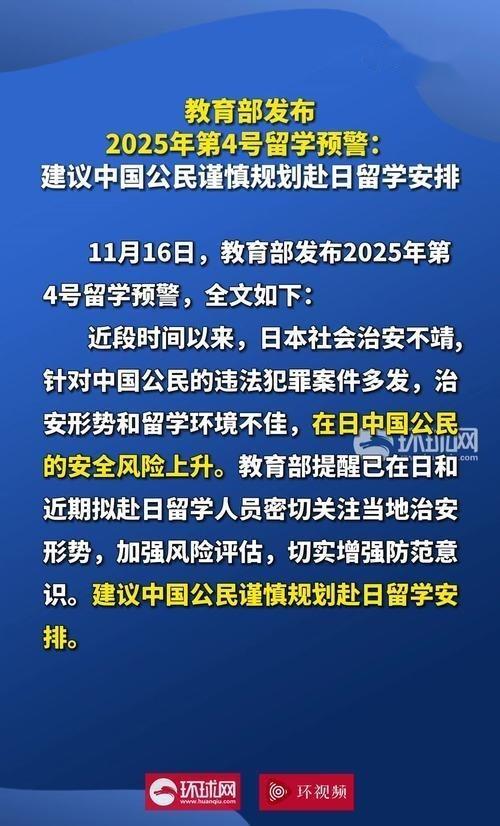 两天后,11月16日,文化和旅游部直接发文,郑重提醒中国游客近期别去日本旅游,已在日本的也要注意安全。教育部同一天放出2025年第4号留学预警,让准备去日本留学的学生慎重考虑。
