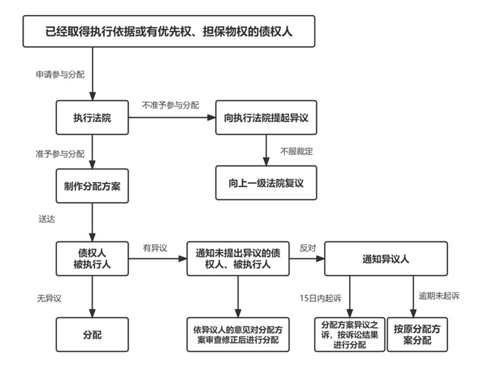 《最高人民法院关于适用<中华人民共和国民事诉讼法>的解释》(法释〔2022〕11号)第五百零九条多个债权人对执行财产申请参与分配的,执行法院应当制作财产分配方案,并送达各债权人和被执行人。债权人或者被执行人对分配方案有异议的,应当自收到分配方案之日起十五日内向执行法院提出书面异议。
