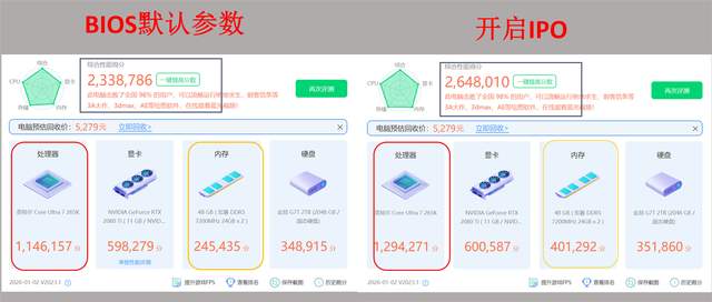 虽然娱乐大师向来都是看个乐子,但是在不改变任何硬件的情况下,直接使用英特尔的IPO优化方案依旧能够见到如此明显的跑分进步,从2338786分直接进步到2648010分,提升13%左右,关键是这部分额外的的性能提升也比咱自己的手动调参要来的方便且简单。