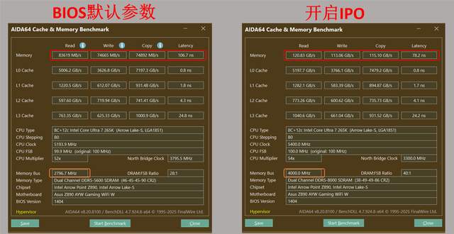 开启IPO之后,直接到了8000Mhz的内存频率,时序为38-49-49-86,此时内存带宽读取速度120.83 GB/S,写入113.06%. GB/S、复制115.10 GB/S,延迟为78.2ns(性能增幅26%),由此可见,这IPO调优对内存带宽和延迟提升的非常明显的,要是打游戏的能这么一顿操作,想必也是会更为丝滑的。