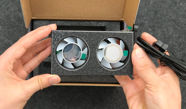 水冷头直接内置高性能三相电机水泵,额定功率0.35A,转速800-3000RPM,而且整机设计轻薄,配合磁吸的显示屏整体安装之后非常稳固,毫无违和感。