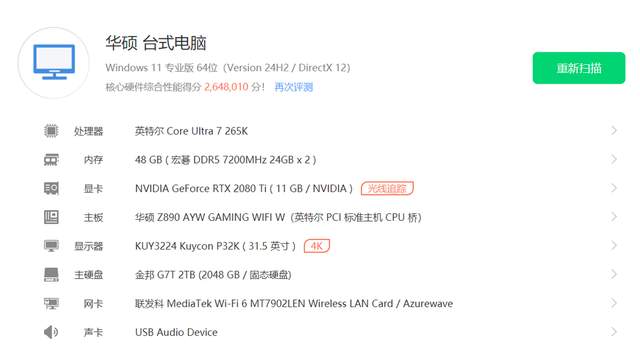 装机完毕之后进行了简单的整理,一套丝滑连招直接点亮,直接上配置图大家一下子看个真切,主要就是凭借英特尔的Ultra7 265K处理器配合华硕的Z890 AYW主板再加上掠夺者的48GB DDR5 8000套装来实现电脑性能在IPO前后的详细对比,性能测试之前,不妨看看本次装机咱都准备了哪些刚需且全面的电脑配件吧!