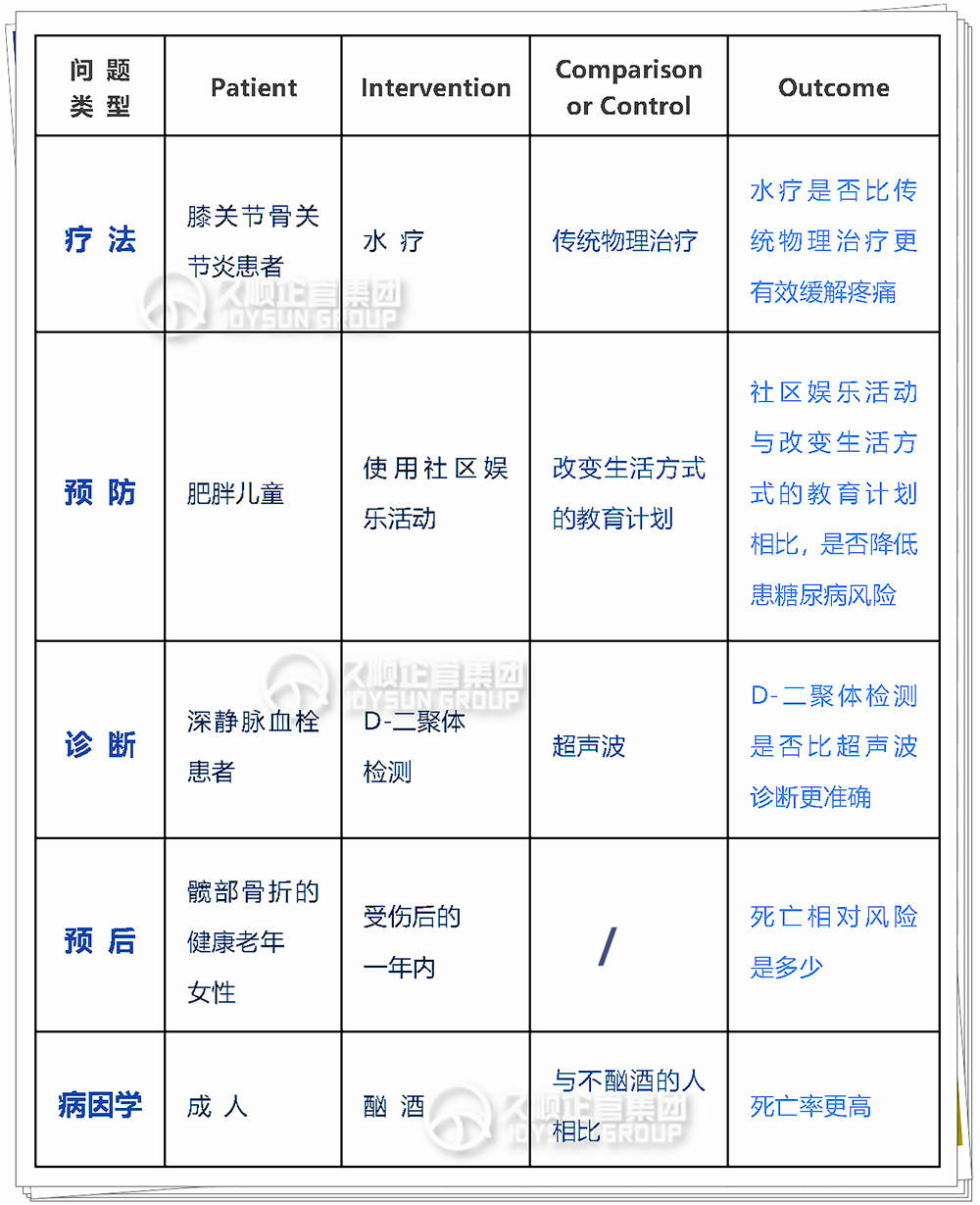 使用PICO框架形成问题时,考虑所提出问题类型(例如:治疗、预防、诊断、预后、病因)是行之有效的方法。