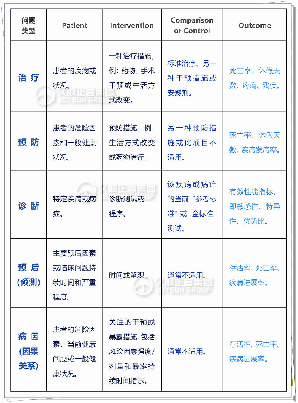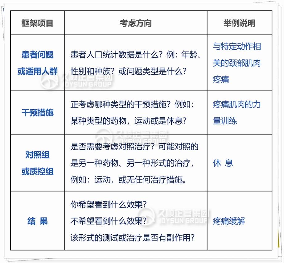 ·Patient 患者问题(或适用人群):既是人群中的一员,又是有健康问题或有风险的人。因此,除年龄和性别外,还需考虑种族、社会经济地位或其他人口统计变量。