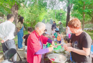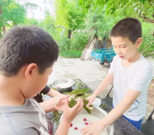 工作人员耐心地指导小朋友和妈妈完成包粽子。孩子们特别开心,妈妈们一边包粽子一边唠着家常。现场有一位90多岁的阿姨,她每年都来参加我们的端午节活动。阿姨面容慈祥,精神矍铄,包粽子的手艺更是非常之高,只见她熟练地拿起粽叶弯成一个三角漏斗状,盛满江米和小枣,用五彩绳三两下缠绕,一个个形状规整的粽子就包好了。