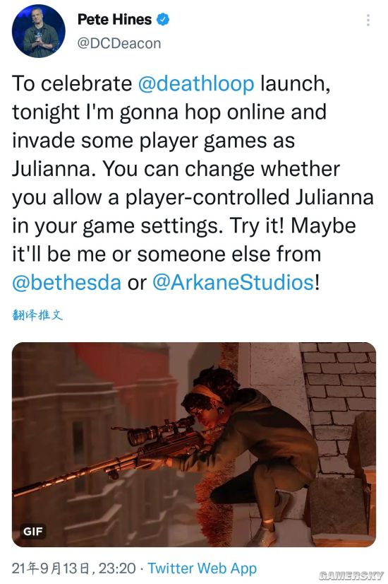 由Arkane工作室和B社制作发行的FPS游戏《死亡循环》的PC与PS版游戏均已于今日正式上线。 同时,B社全球营销副总裁Pete Hines宣布,他将在今天的在线游戏中扮演“朱莉安娜”入侵到玩家的游戏中。 当然,参与这场“制作组大战玩家”比赛的人不止他一个,来自贝塞斯达或者Arkane工作室的其他制作人员也将参与入侵其他玩家的游戏。