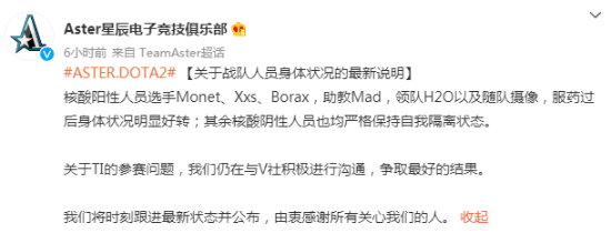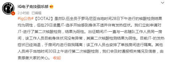 今日凌晨,出征罗马尼亚Ti10赛事的多家《Dota2》中国战队陆续公布了各自战队成员的疫情影响情况:iG战队选手JT-新冠检测呈阳性,已经开始自我隔离;小象战队已经终止了后续的训练计划,全员观察;Aster战队新冠阳性的Monet等人已经服用药物,身体状况开始好转,其余成员均保持严格自我隔离。