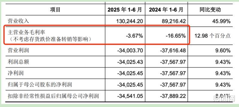这样解释的背后可以看出的是,西安奕材在12英寸硅片行业为新进入者,其在产能规模、产品品类、客户议价能力等方面均与同业存在差距,这种低毛利率或将使得其在面对市场竞争和价格波动时,缺乏足够的利润空间应对。而在2025年上半年,公司营收同比增长45.99%至13.02亿元,但净利润仍亏损3.4亿元,毛利率虽从2023年的0.66%回升至5.49%,但剔除存货跌价准备后,主营业务毛利率仍为-8.79%,远低于行业均值。