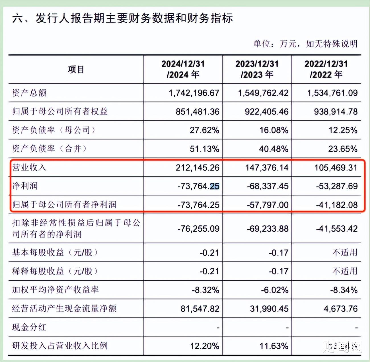 招股书显示,2021年至2024年间,西安奕材营业收入从2.07亿元增至21.21亿元,其增长速度相当于翻了10倍之多。但同期归母净利润却从-5.21亿元亏损扩大至-7.38亿元,四年间累计亏损超24.65亿元。