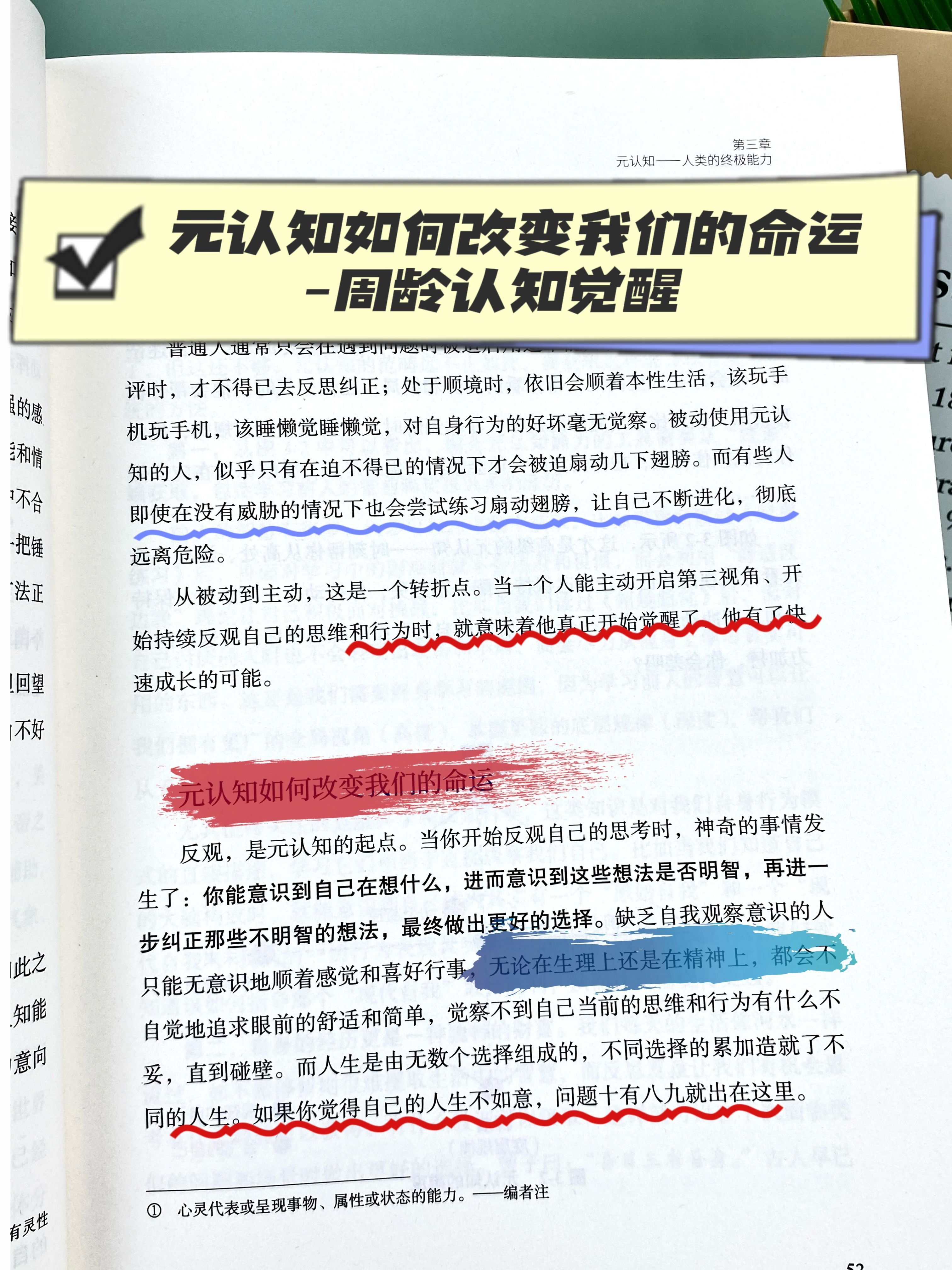 反观,是元认知的起点。当你开始反观自己的思考时,神奇的事情发生了:你能意识到自己在想什么,进而意识到这些想法是否明智,再进一步纠正那些不明智的想法,最终做出更好的选择。缺乏自我观察意识的人只能无意识地顺着感觉和喜好行事,无论在生理上还是在精神上,都会不自觉地追求眼前的舒适和简单,觉察不到自己当前的思维和行为有什么不妥,直到碰壁。而人生是由无数个选择组成的,不同选择的累加造就了不同的人生。如果你觉得自己的人生不如意,问题十有八九就出在这里。