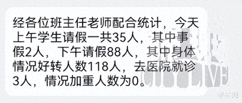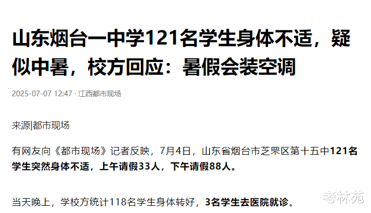 日前,有网友向媒体反映,称山东省烟台市芝罘区某中学7月4日那天有121名学生突然身体不适,上午请假33人,下午请假88人。(来源:江西都市现场)