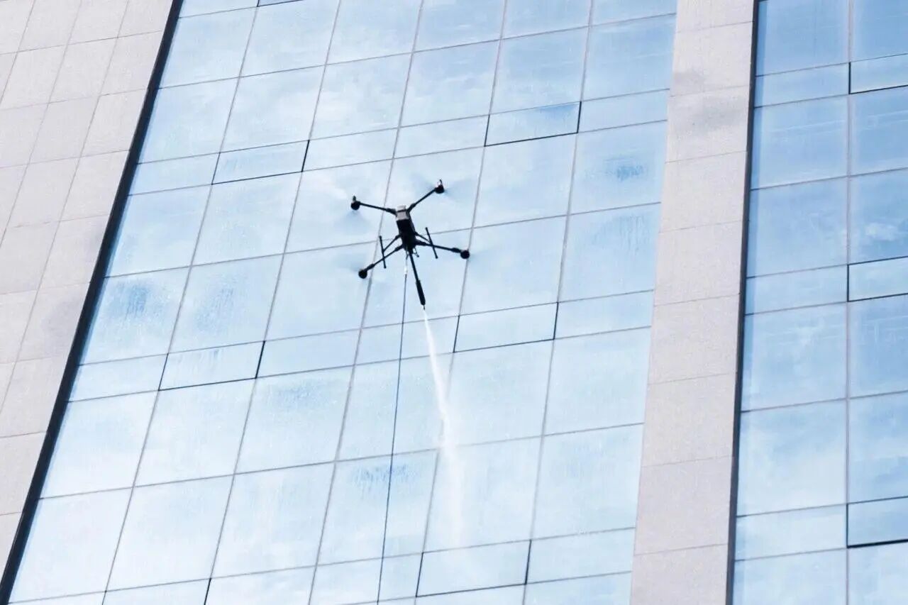 这些无人机接通水管后,能「自动完成打湿、喷清洁剂、冲洗」全套流程,不到半小时就清洁完「200多平方米」的玻璃幕墙,而人工干同样的活至少要一天。既规避了高空作业的风险,效率还提升五到二十倍,这才是科技该有的“硬核实力”。