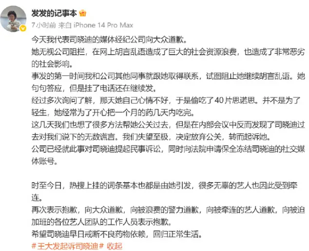 值得注意的是,声明后半段态度反转,直接披露内部沟通细节,将主要责任推给司晓迪:“自司晓迪产生发表不当言论的想法后,公司管理层及经纪人多次约谈劝阻,明确告知其言论可能引发的后果,甚至暂停部分工作试图引导其冷静。但司晓迪无视阻拦,执意通过个人渠道发布相关内容,后续产生的法律责任、商业损失及个人口碑影响,将由其自行承担主要责任。” 此外,声明还提及“已启动内部追责程序,保留追究其违约责任的权利”,字里行间满是不满与无奈。