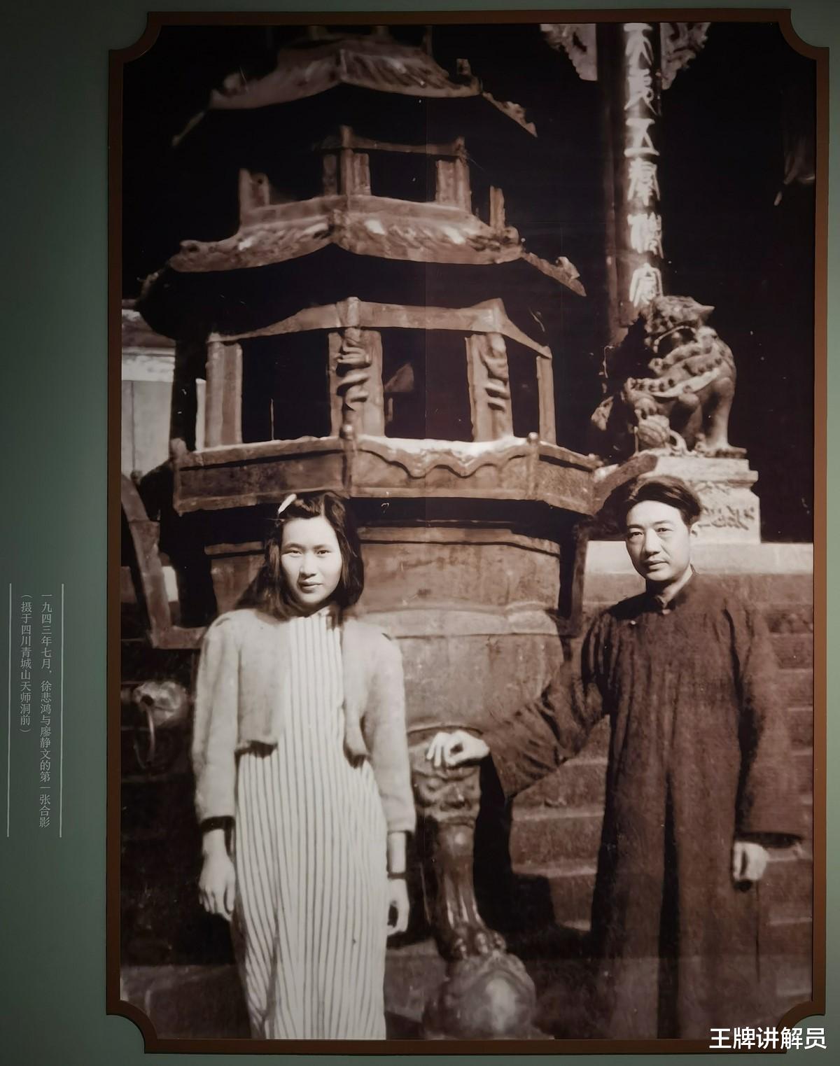 左手边则是一张张老照片,以时间为序,串联起从少年时期开始的徐悲鸿生平。走到左墙尽头,时间恰好前进到1942年,然后转去右墙的展线,迎面便是一张巨大的合影,那是1943年7月的四川青城山,徐悲鸿与廖静文的第一张合影。你明白策展人的用意:左墙是相遇前的他,从右墙开始是相遇后的他们。