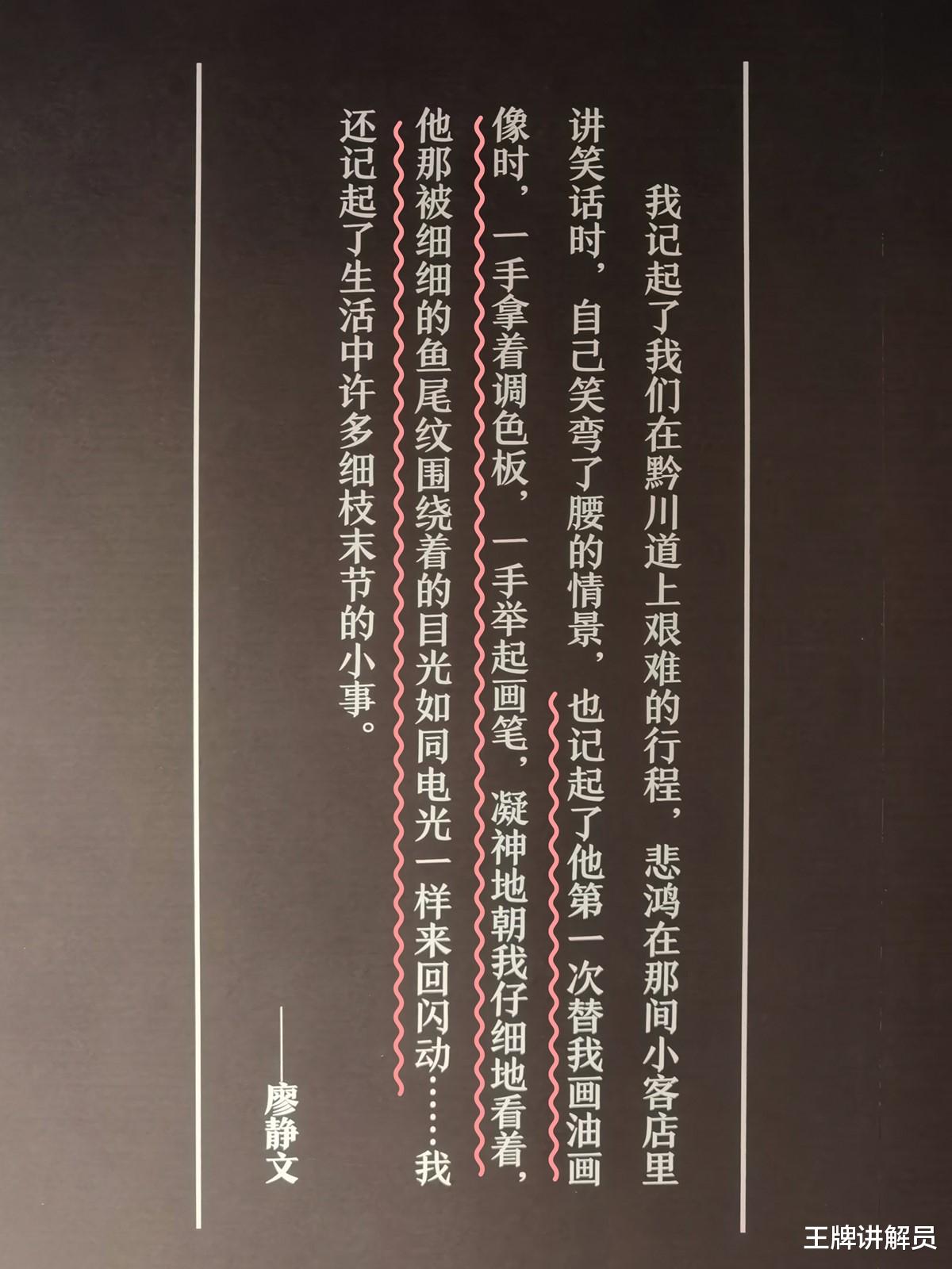 她在书中写道:我在漫无止境的沉思默想中,依旧和悲鸿生活在一起,在漓江的小船上,在嘉陵江边,在磐溪……我听见悲鸿在叫我,又是那个在磐溪的、风雨交加的夜晚,悲鸿带着那么多爱、那么多惶恐、那么多焦虑的声音在叫喊:“静文!你在哪里?静文!静文!你在哪里?”