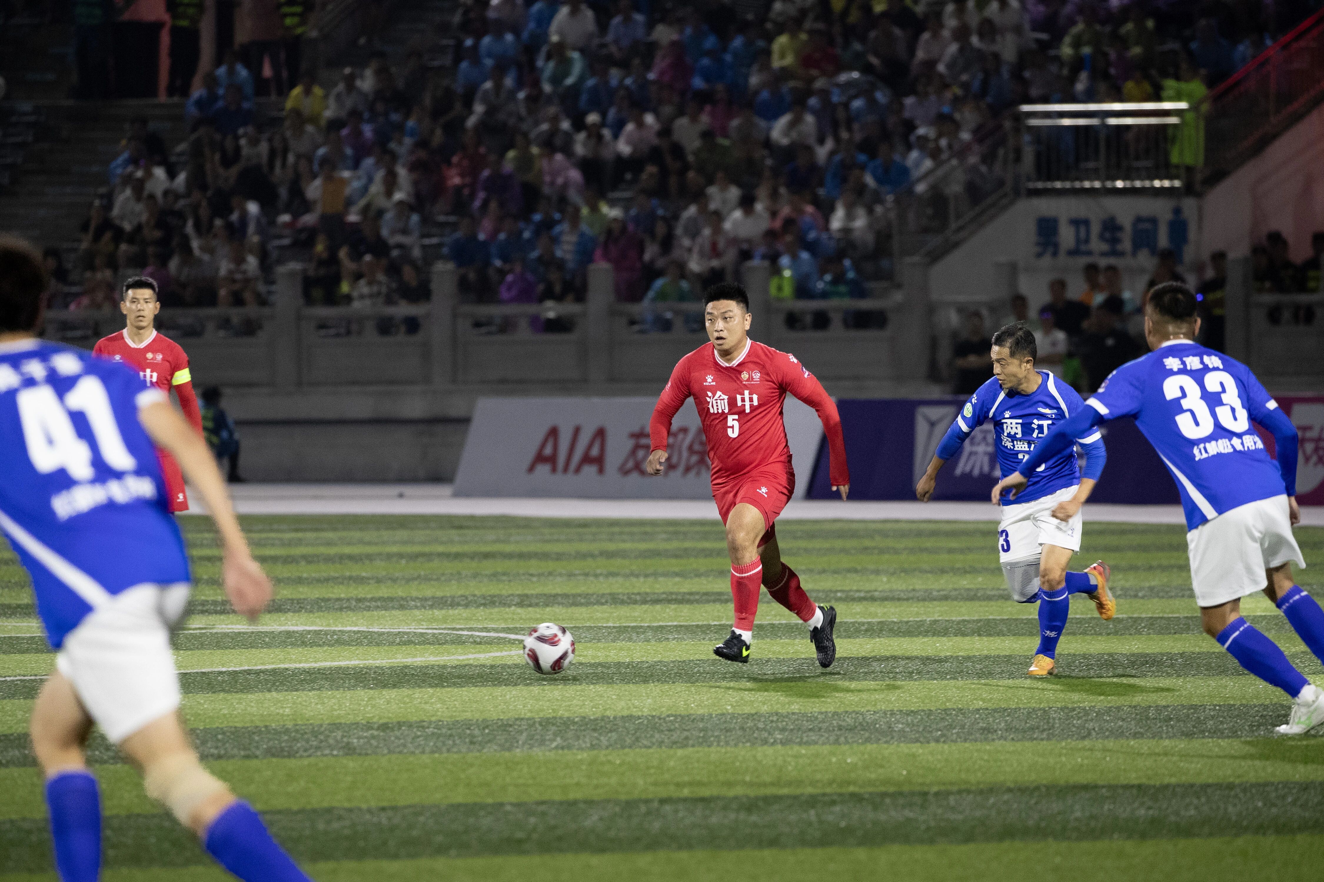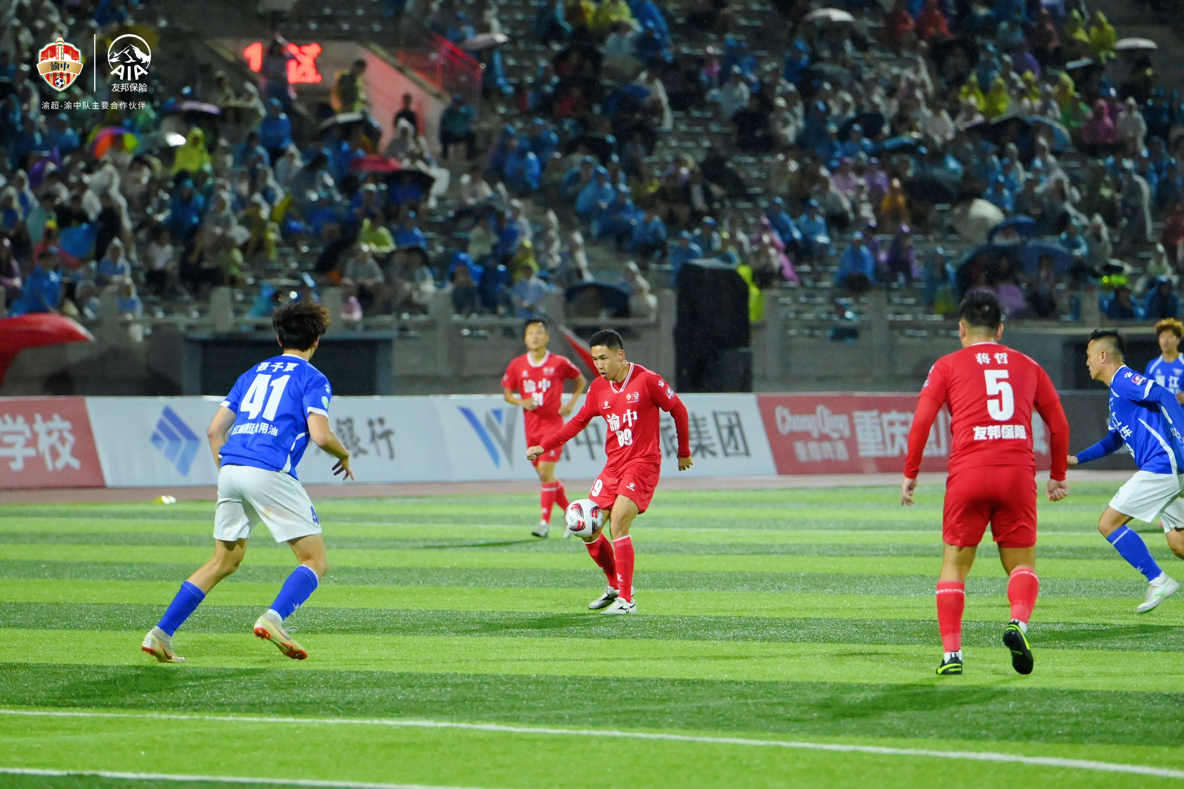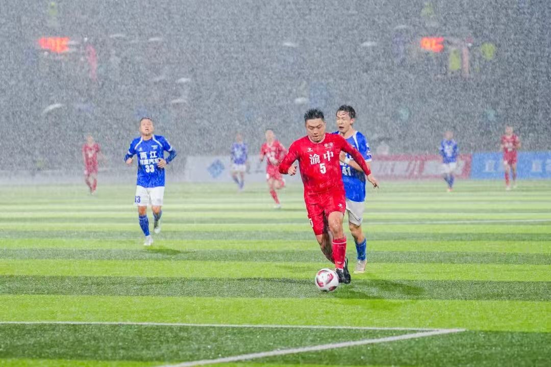 主场作战的渝中半岛队凭借技术优势,在开场后迅速掌控了比赛节奏,向两江深蓝汽车队的半场发起连续进攻。雨水击打在球员们早已被汗水与雨水浸透的球衣上,皮球在积水的草皮上开始出现不规则的滑动,传接球失误随之增多。