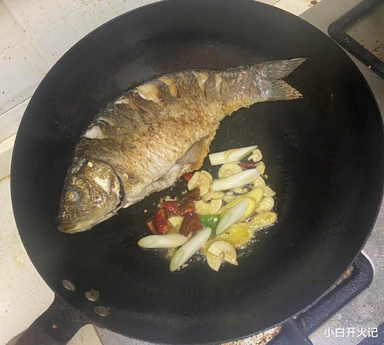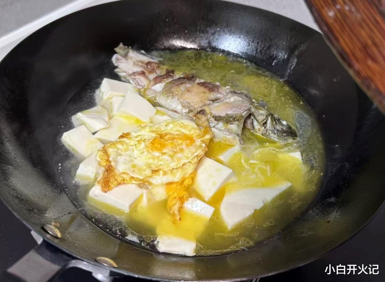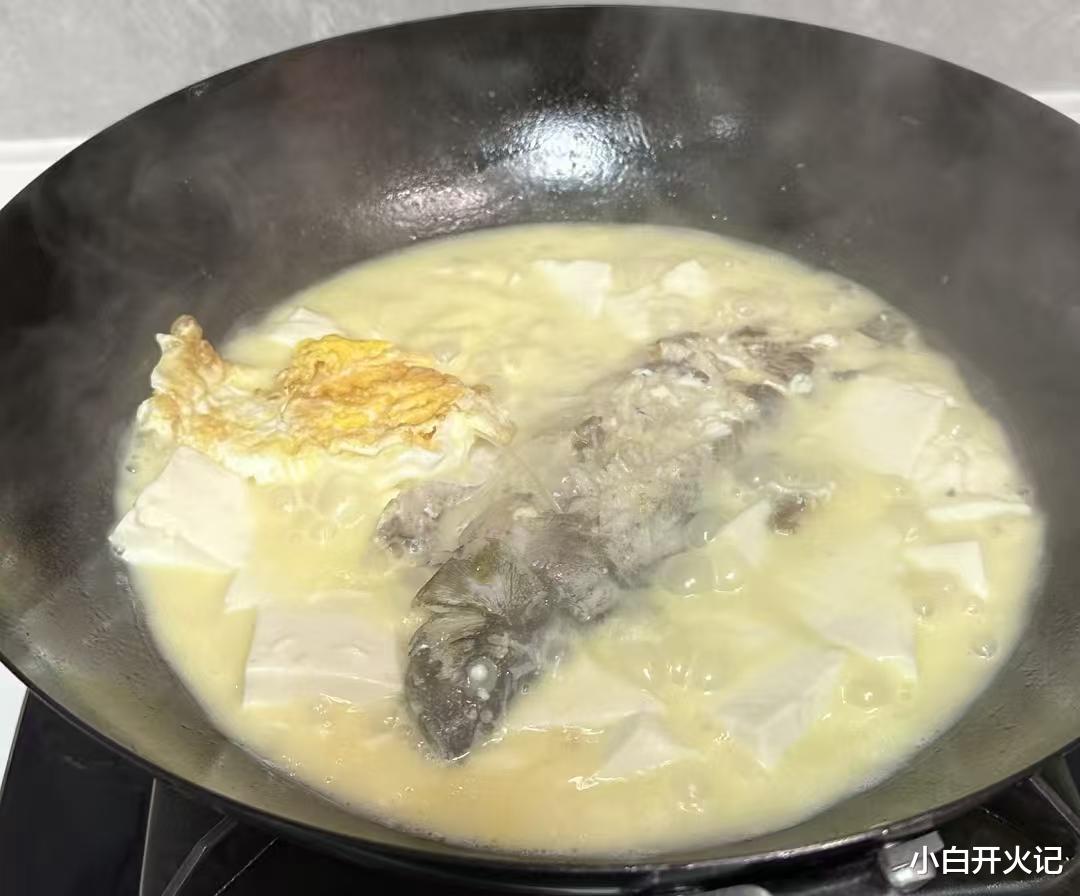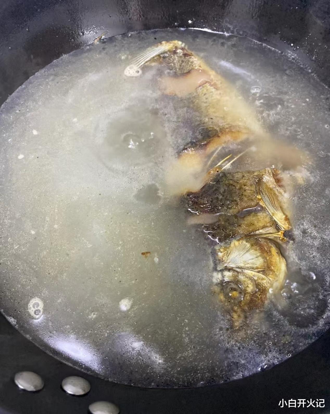 煎好的鱼推到一边,下姜片爆香,再喷入一勺料酒,"呲啦"一声,腥味瞬间蒸发。倒入滚烫的开水,记住一定要开水,这是汤色奶白的关键。大火煮开后转中火,保持汤面微微沸腾的状态,让鱼肉的营养充分释放到汤里。