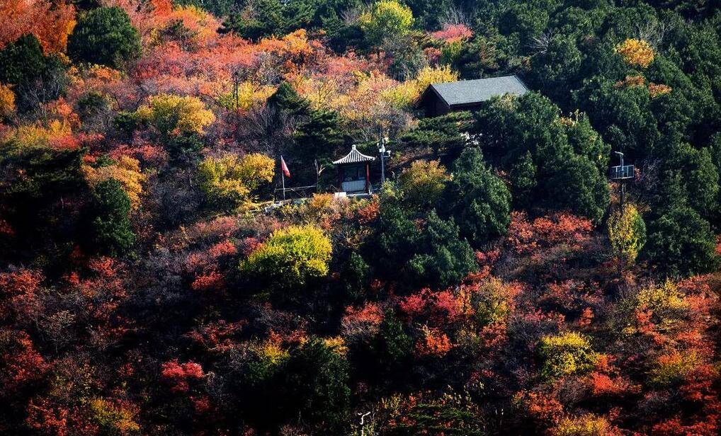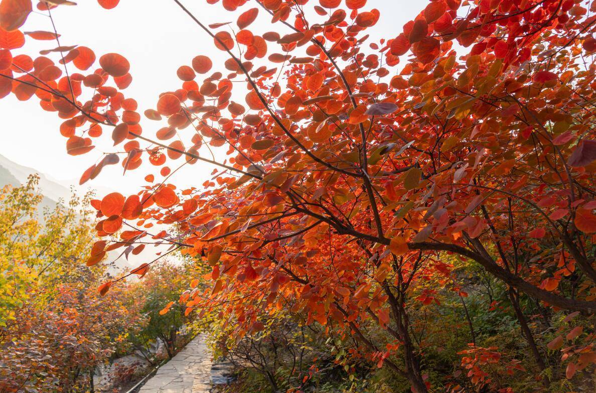 沿着香山的石阶上行,红叶愈发茂密。它们或攀附在老树枝桠上,层层叠叠铺成一片红色的云;或扎根在石阶两侧,叶片几乎触手可及。风过时,满树红叶轻轻摇曳,水珠纷纷坠落,像是一场细碎的红雨,空气中混着黄栌的清香与雨水的微凉,沁人心脾。远处的鬼见愁在晨雾中若隐若现,唯有这片红叶林清晰如泼墨,红得热烈,却不张扬,与山间的青灰岩石、墨绿松针相映成趣,构成一幅浓淡相宜的山水画