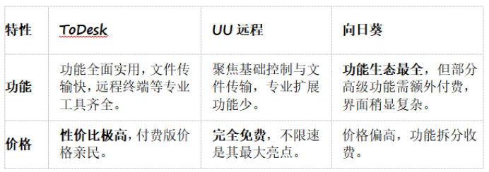 小结:UU远程胜在免费;向日葵功能最全但价格高且臃肿;ToDesk在顶级性能与安全性的基础上,提供了极具诚意的价格,性价比脱颖而出。