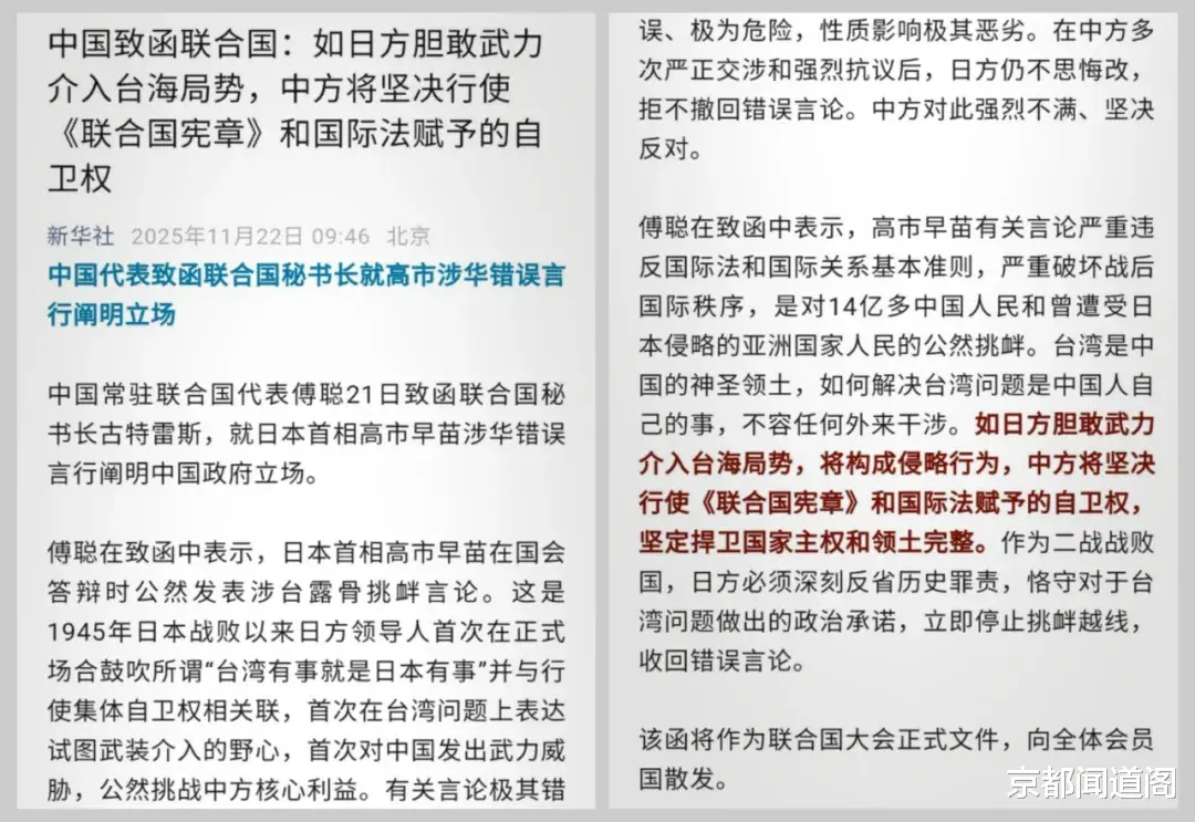 中国常驻联合国代表傅聪11月21日致函联合国秘书长古特雷斯,就日本首相高市早苗涉华错误言行严正阐明中国政府立场:若日方胆敢武力介入台海局势,中方将坚决行使《联合国宪章》和国际法赋予的自卫权,绝不姑息!