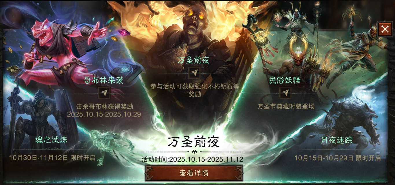核心玩法:四大限时活动齐开:魂之试炼(恐怖恶魔突袭)、哥布林来袭(新哥布林必掉套装 / 传奇)、异界入侵、月夜迷踪(狼人 vs 人类阵营对抗)。