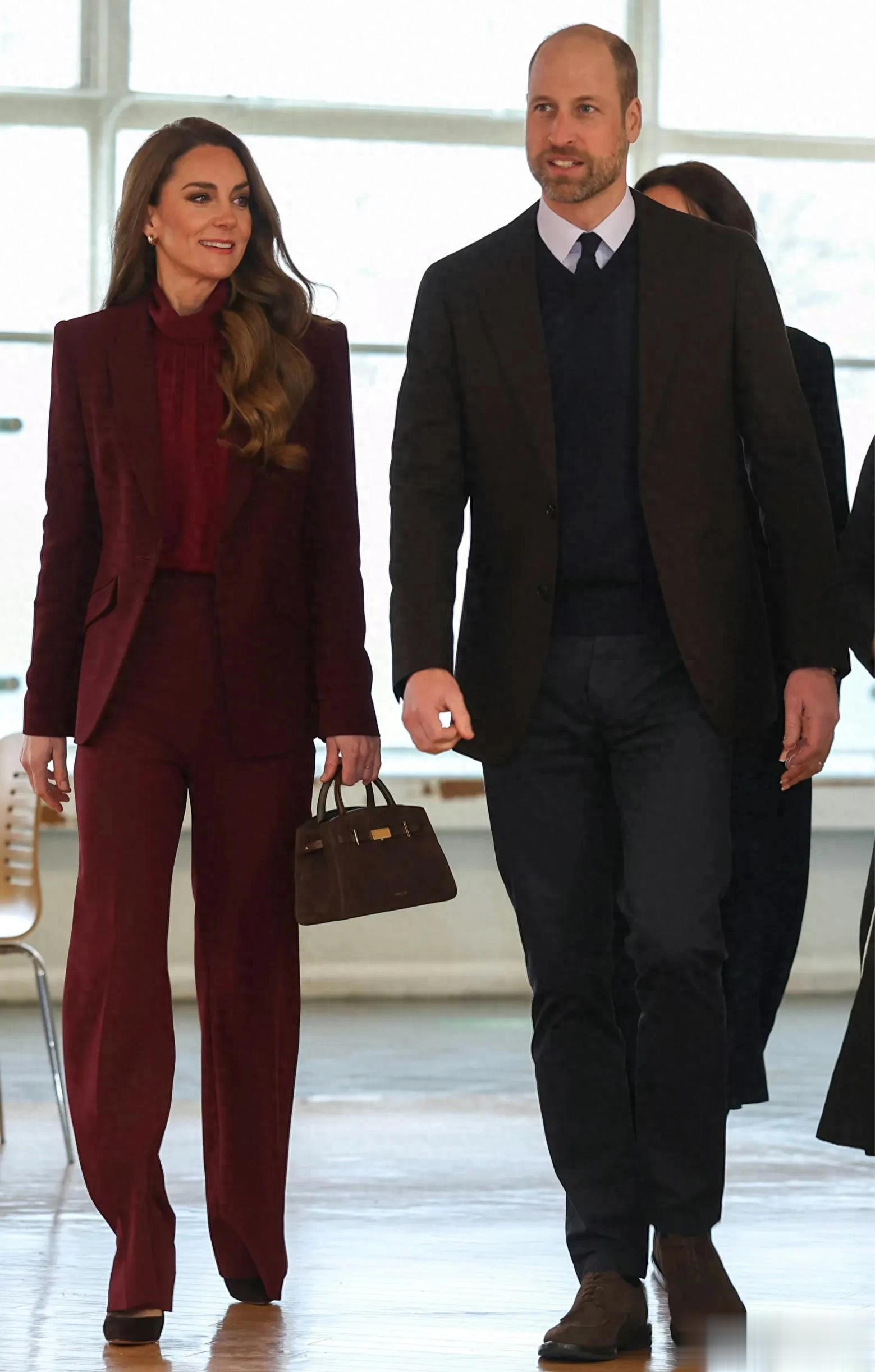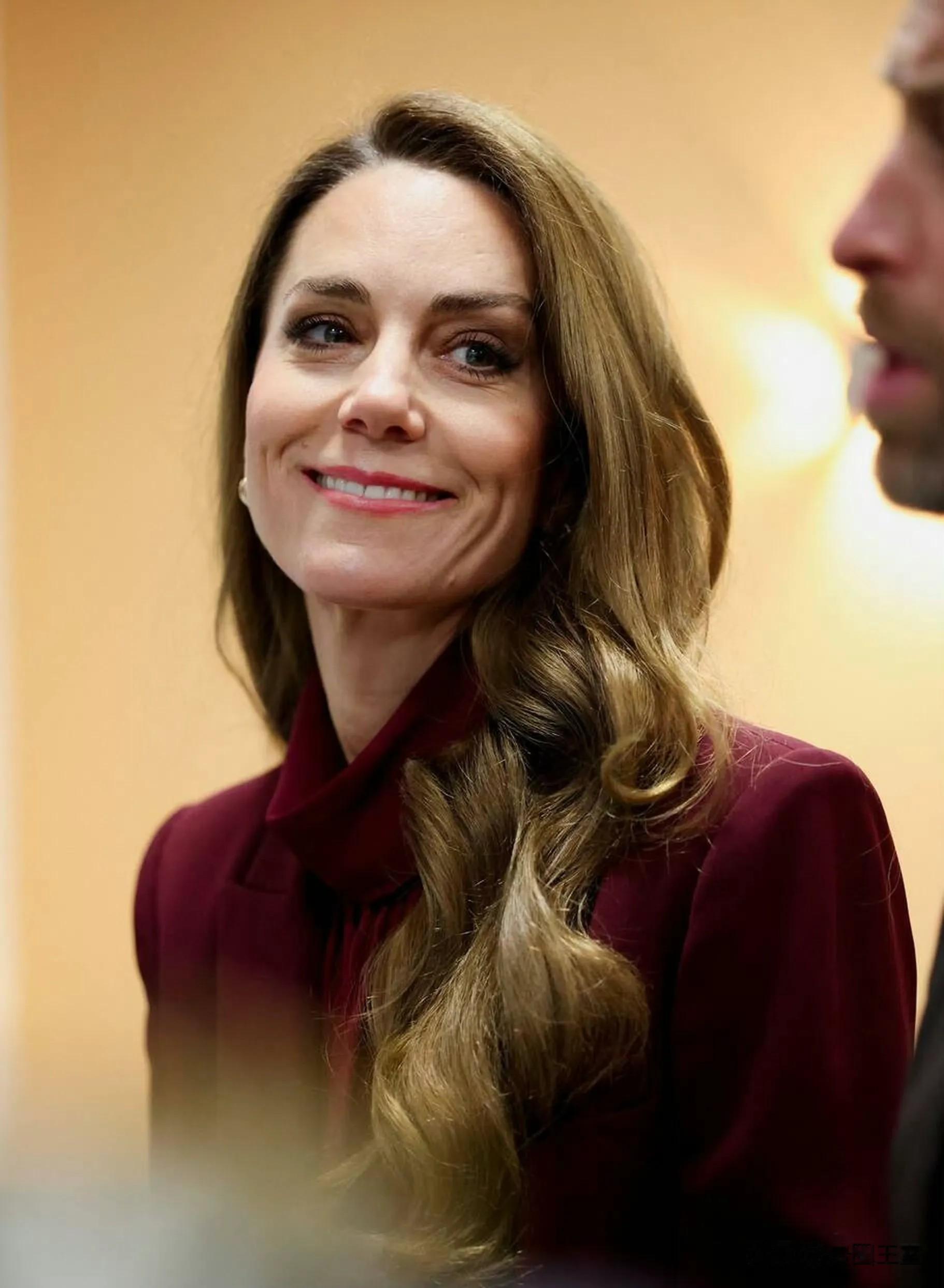 43岁的凯特王妃身穿酒红色西装,脚踩高跟鞋亮相,一头标志性的大波浪长发优雅迷人,这次的妆容也不错,尤其是口红的颜色很适合她。